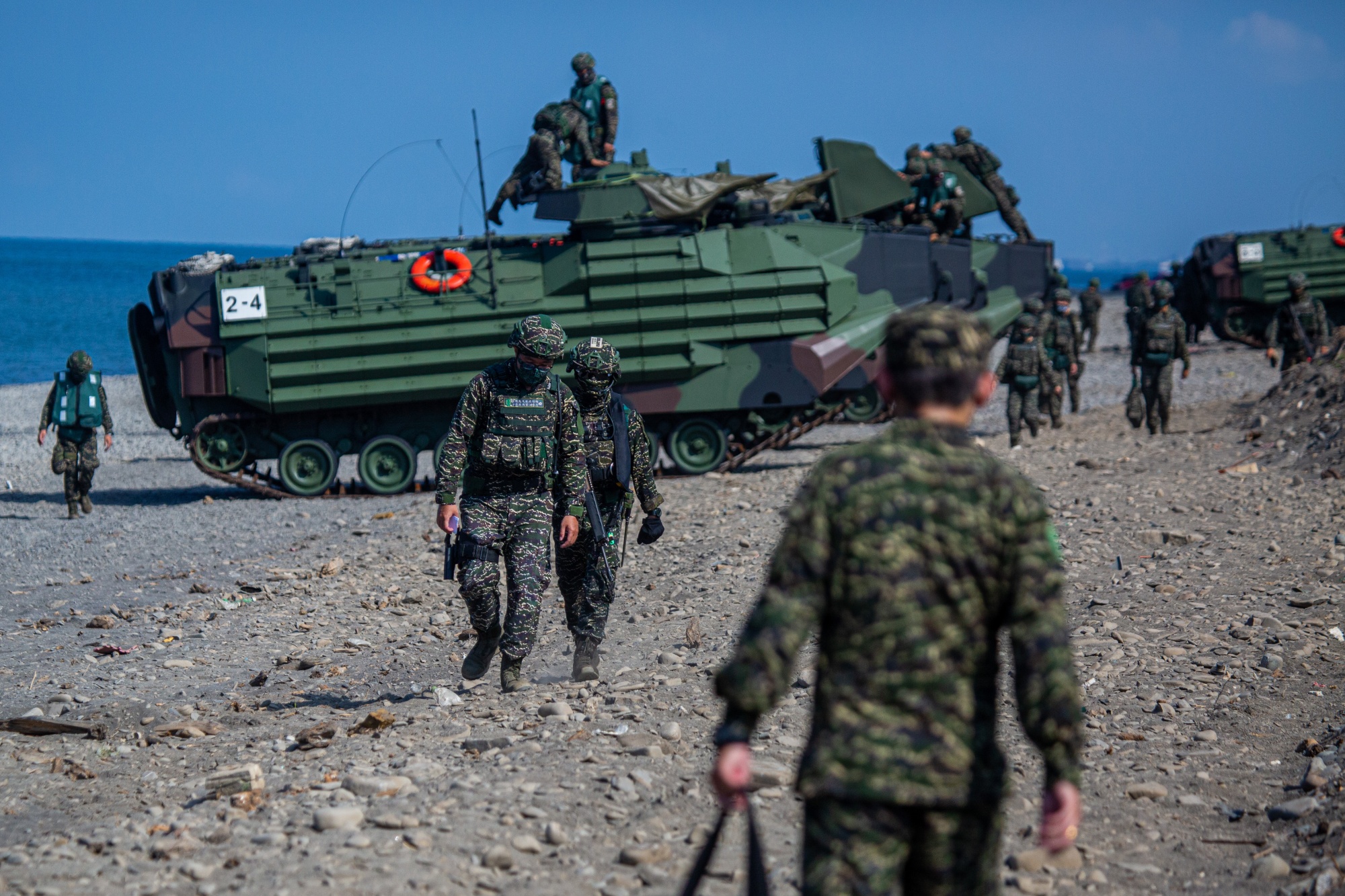 台湾士兵在七月进行演习,模拟中国入侵。摄影师:安娜贝尔·齐/盖蒂图片社