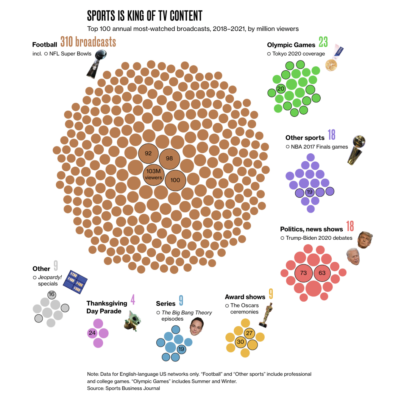 Bloomberg发布了一些出色的信息图表,以说明付费电视行业对体育的依赖,同时转播权的成本正在飙升。我想在这里分享其中一个。这是过去四年电视上最受欢迎节目中体育的份额: