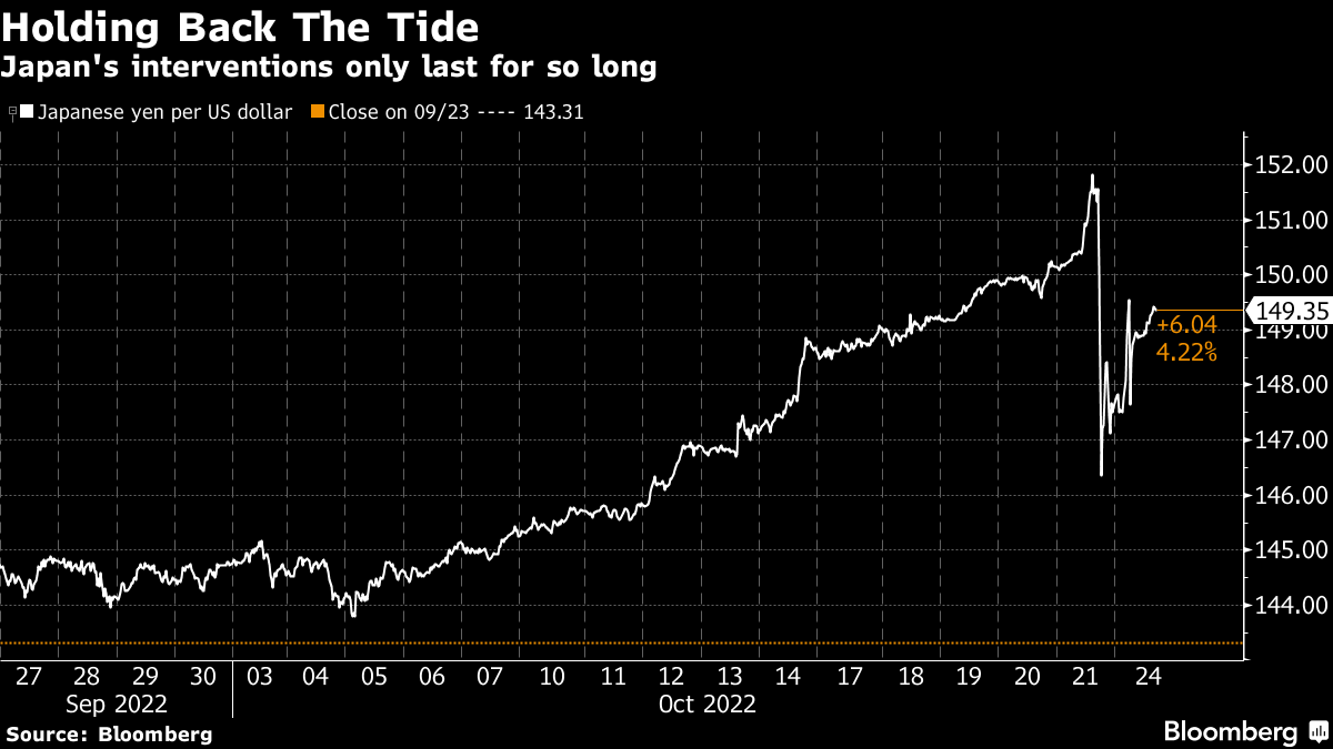 今年日元大幅贬值。上周末,日本当局决定他们已经受够了,他们介入市场,将日元兑美元的价格从150以上拉回到147以下。然而,这种干预似乎已经开始失效。