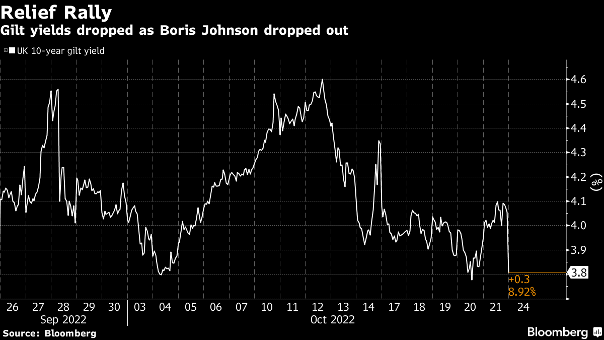 鲍里斯·约翰逊退出角逐首相的行列。可以说,市场感到宽慰。英国国债收益率急剧下降(您在下面图表中看到的白线末端的下降是英国的借款成本下降)。