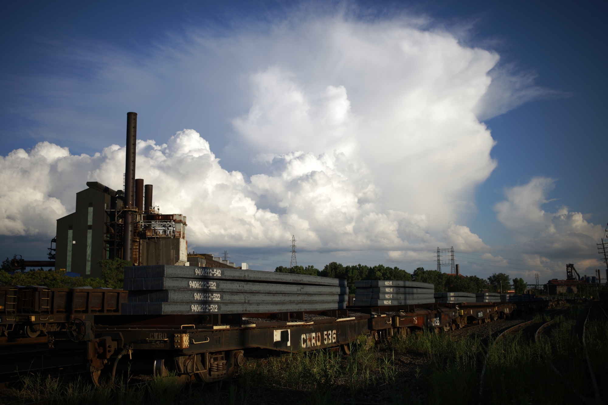 一列货运火车在俄亥俄州克利夫兰的Cleveland-Cliffs Inc. 钢铁厂运载钢材。