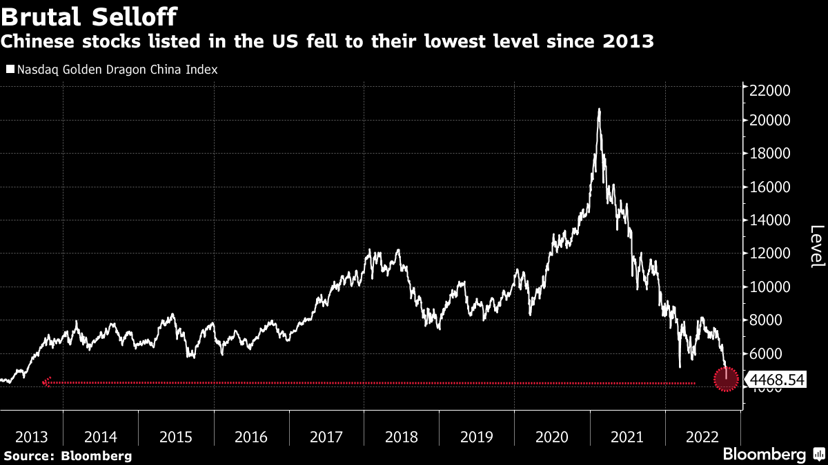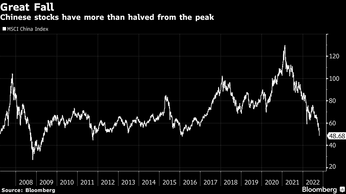 与此同时,MSCI中国指数昨日下跌了8%,目前比2021年峰值下跌超过60%。