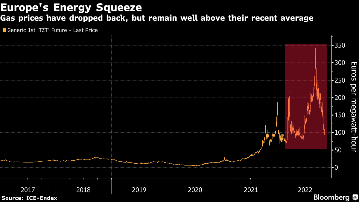 欧洲天然气价格正在从夏季的高点暴跌,但企业和家庭将不得不等待从高通胀压力中获得缓解。由于填充储存设施的进展超出预期,以及温和的天气,基准期货价格已跌破每兆瓦时100欧元(99美元),这是自6月以来首次。