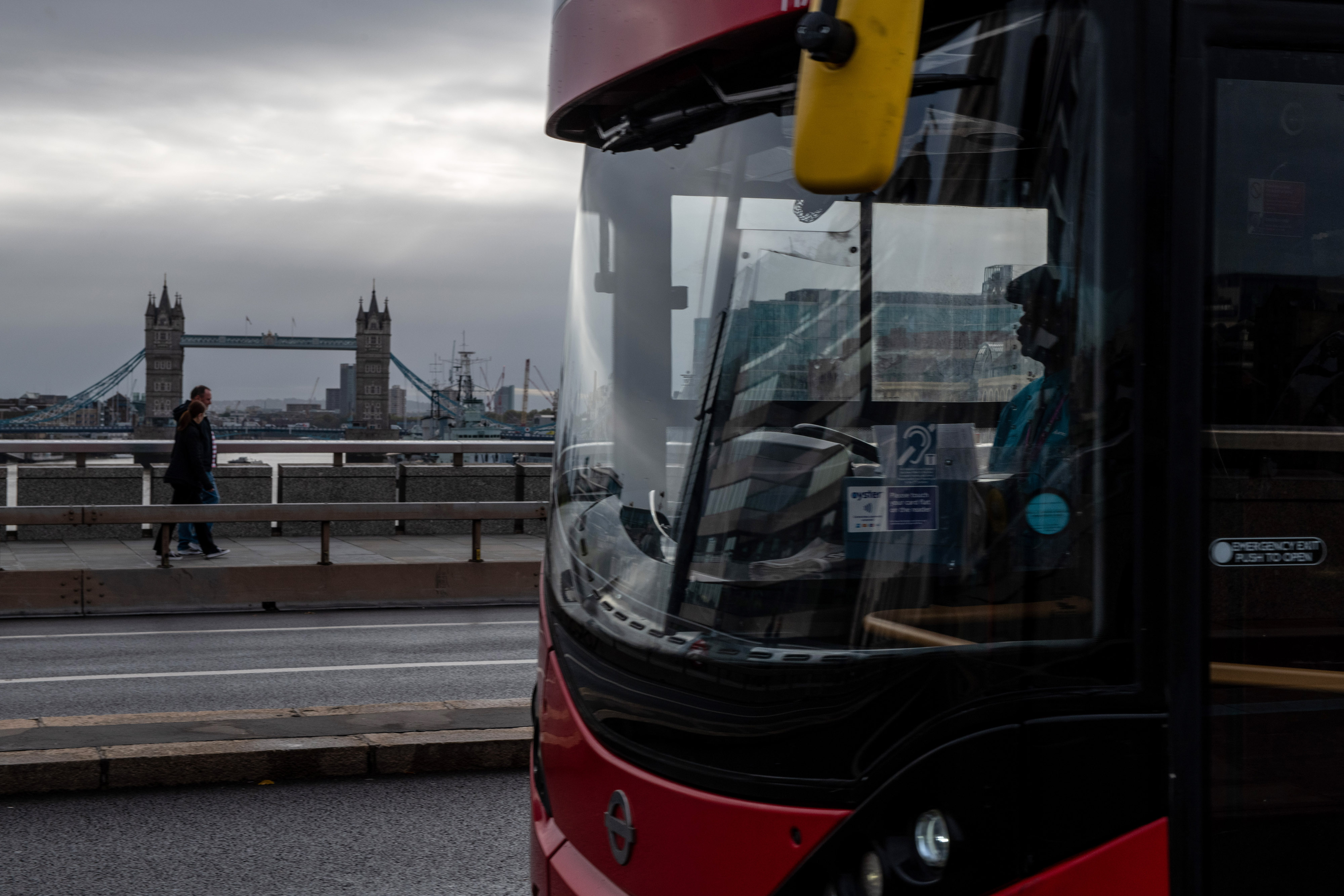 一辆公共汽车穿过泰晤士河,经过伦敦市的伦敦塔桥。摄影师:克里斯·J·拉特克利夫/彭博社