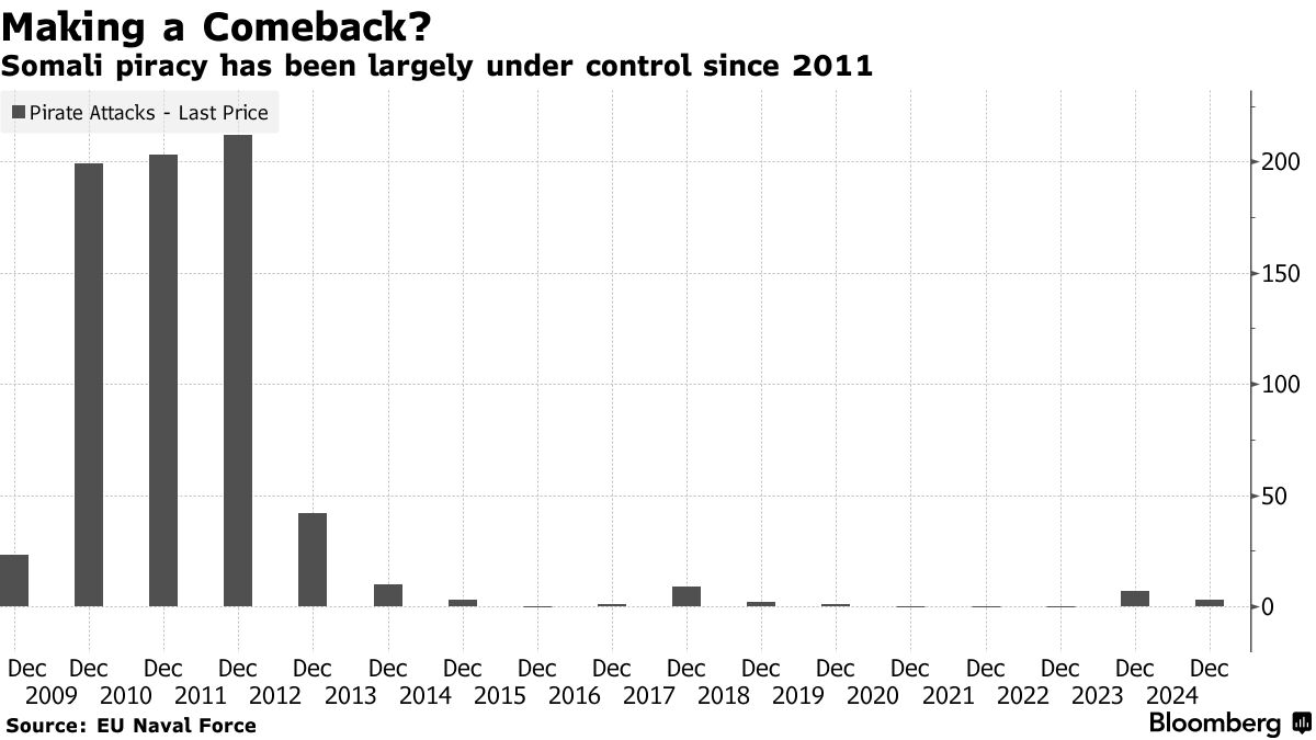 根据EUNavfor的数据,索马里海岸的海盗袭击在2009年至2011年间每年达到约200起高峰。截至2024年已过去一个多月,已经发生了三起,数据显示。