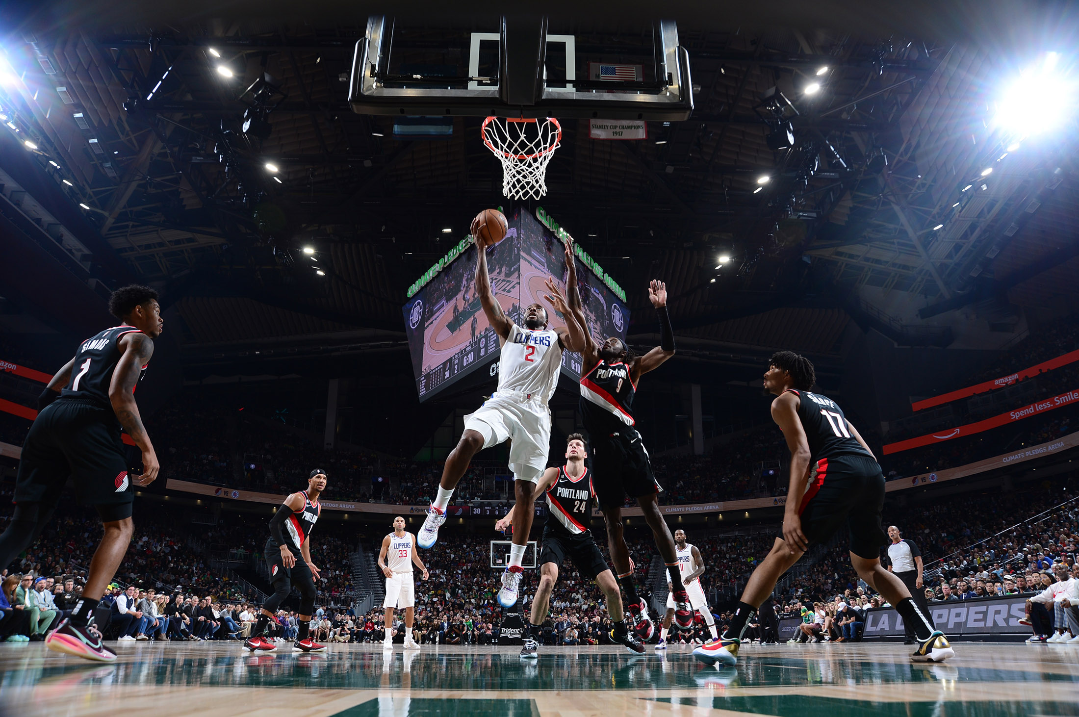 洛杉矶快船队的卡哇伊·伦纳德在西雅图的气候誓约竞技场对阵波特兰开拓者队的季前赛中投篮,日期为10月3日。摄影师:迈克尔·冈萨雷斯/NBAE/Getty Images