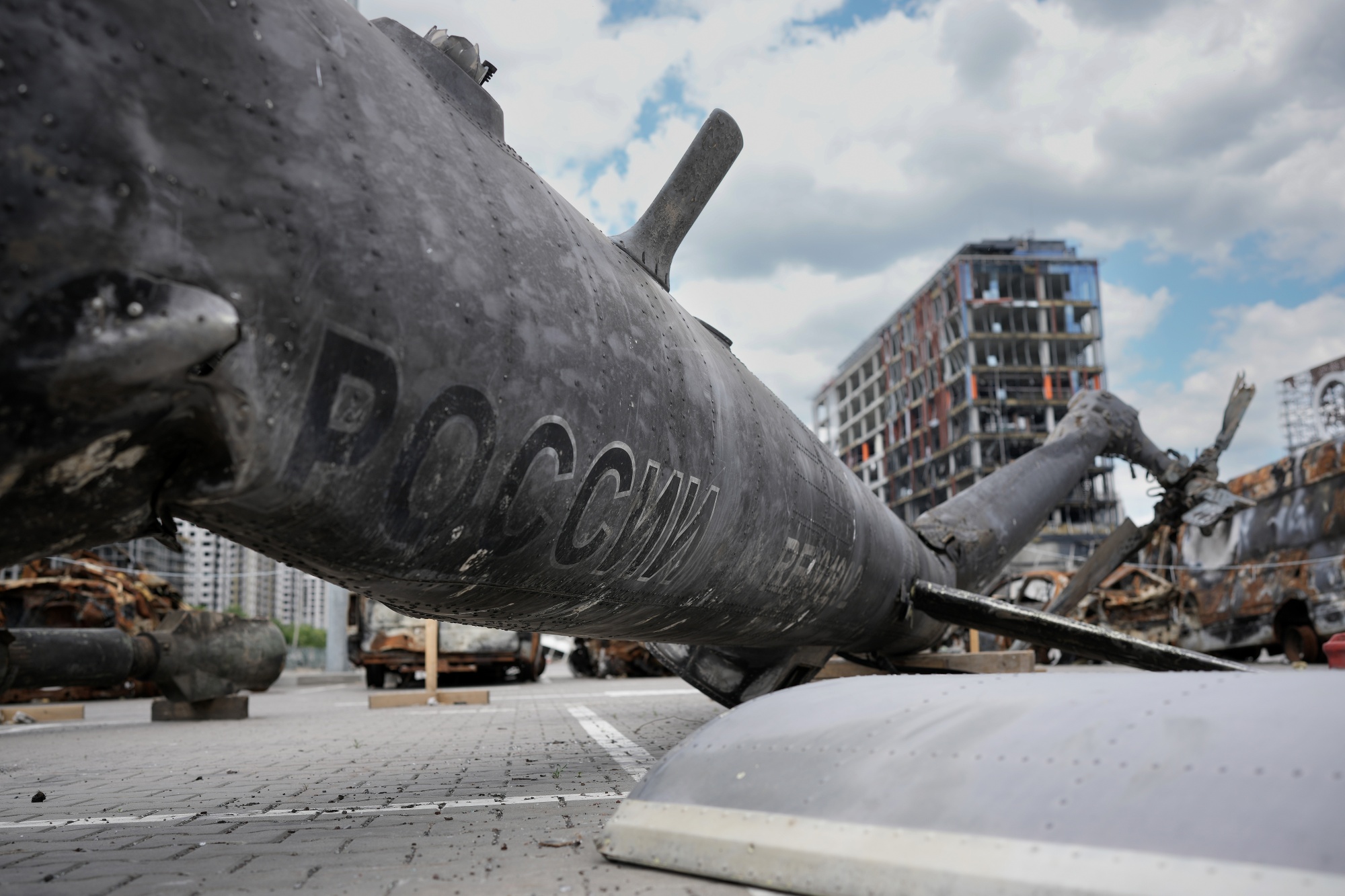 一架俄罗斯直升机的残骸存放在基辅Retroville购物中心的停车场。