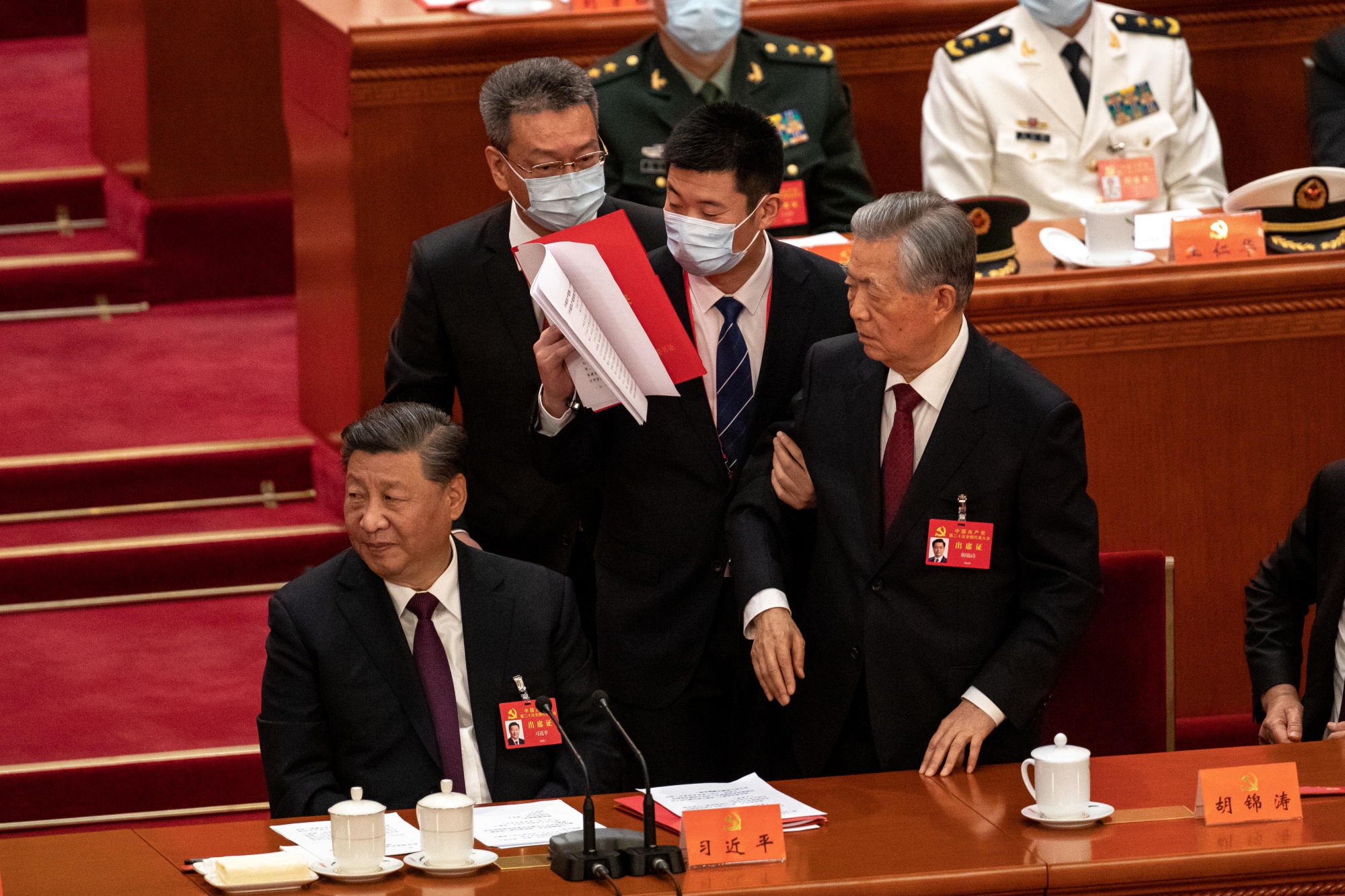观看:前中国领导人胡锦涛于10月22日党代会上走下舞台。