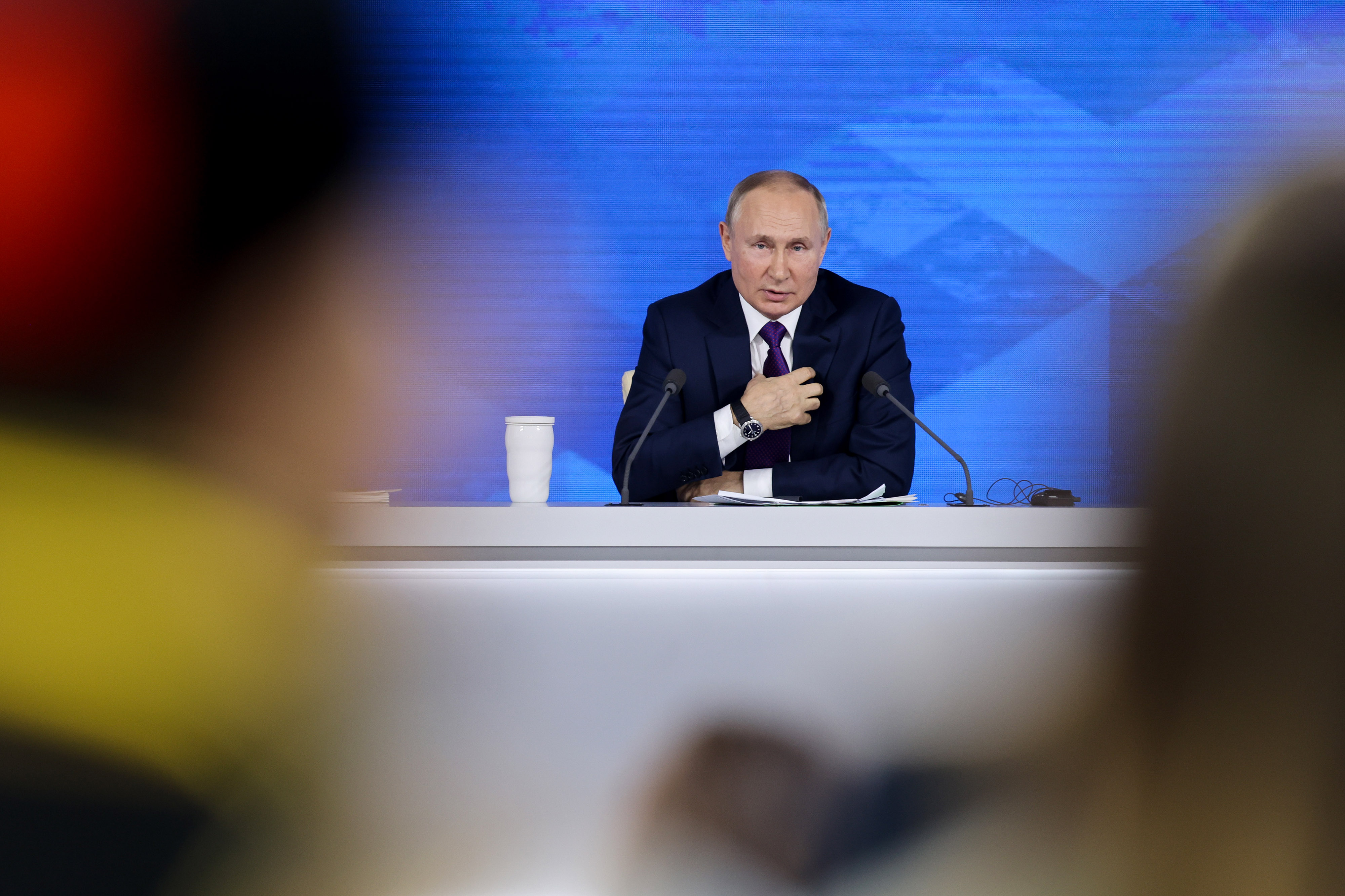 俄罗斯总统弗拉基米尔·普京在2021年12月23日在莫斯科举行年度新闻发布会。