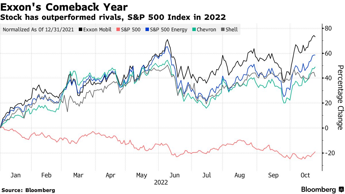 最近几周,埃克森的市值超过了Facebook母公司Meta Platforms Inc.,并且自2019年以来首次重返标普500指数前十大股票之列。股价本周创下历史新高,今年已飙升超过70%,因为高油气价格与更为谨慎的资本支出相结合。