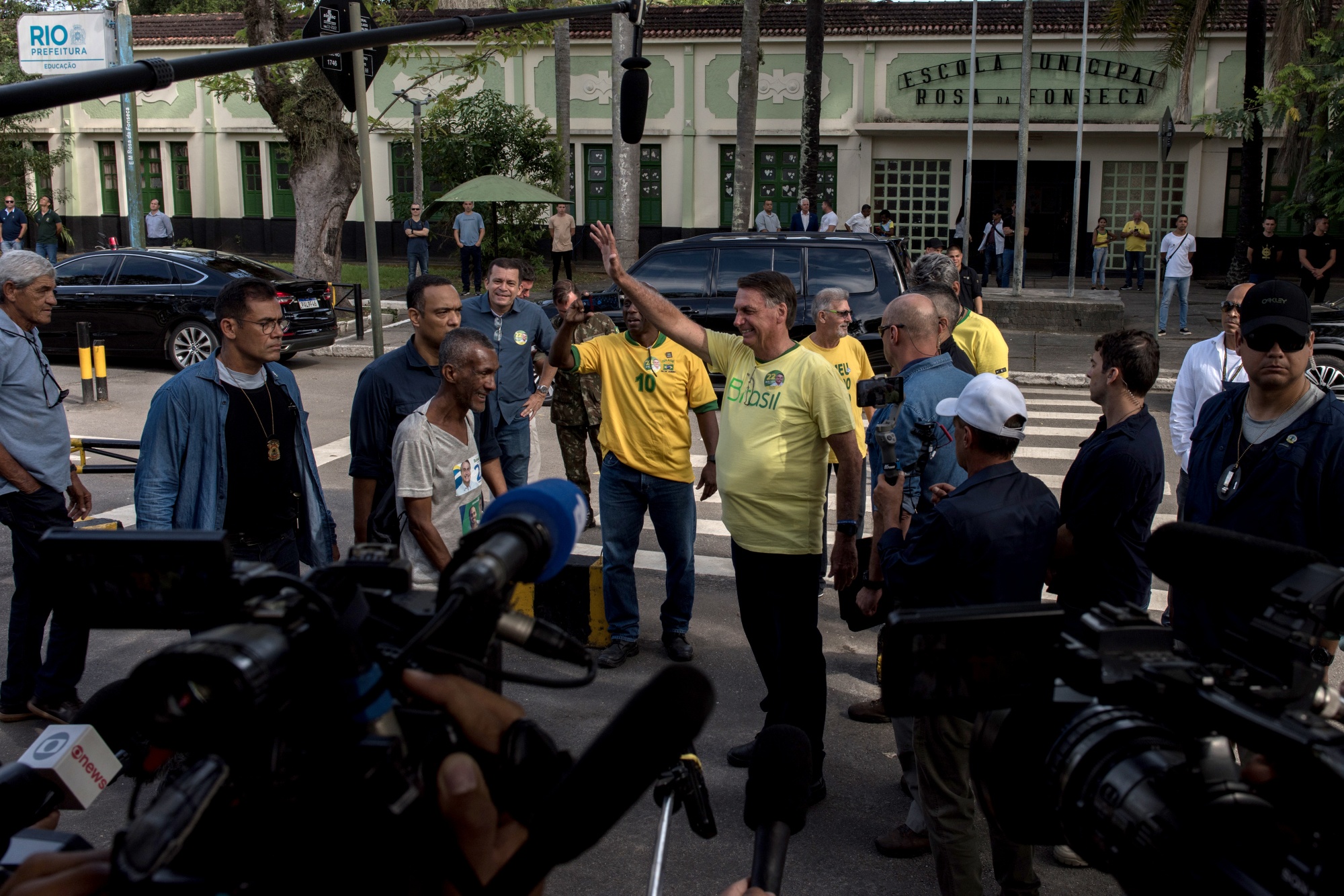 雅伊尔·博尔索纳罗(Jair Bolsonaro)在10月30日在巴西里约热内卢的一个投票站外与媒体代表交谈。