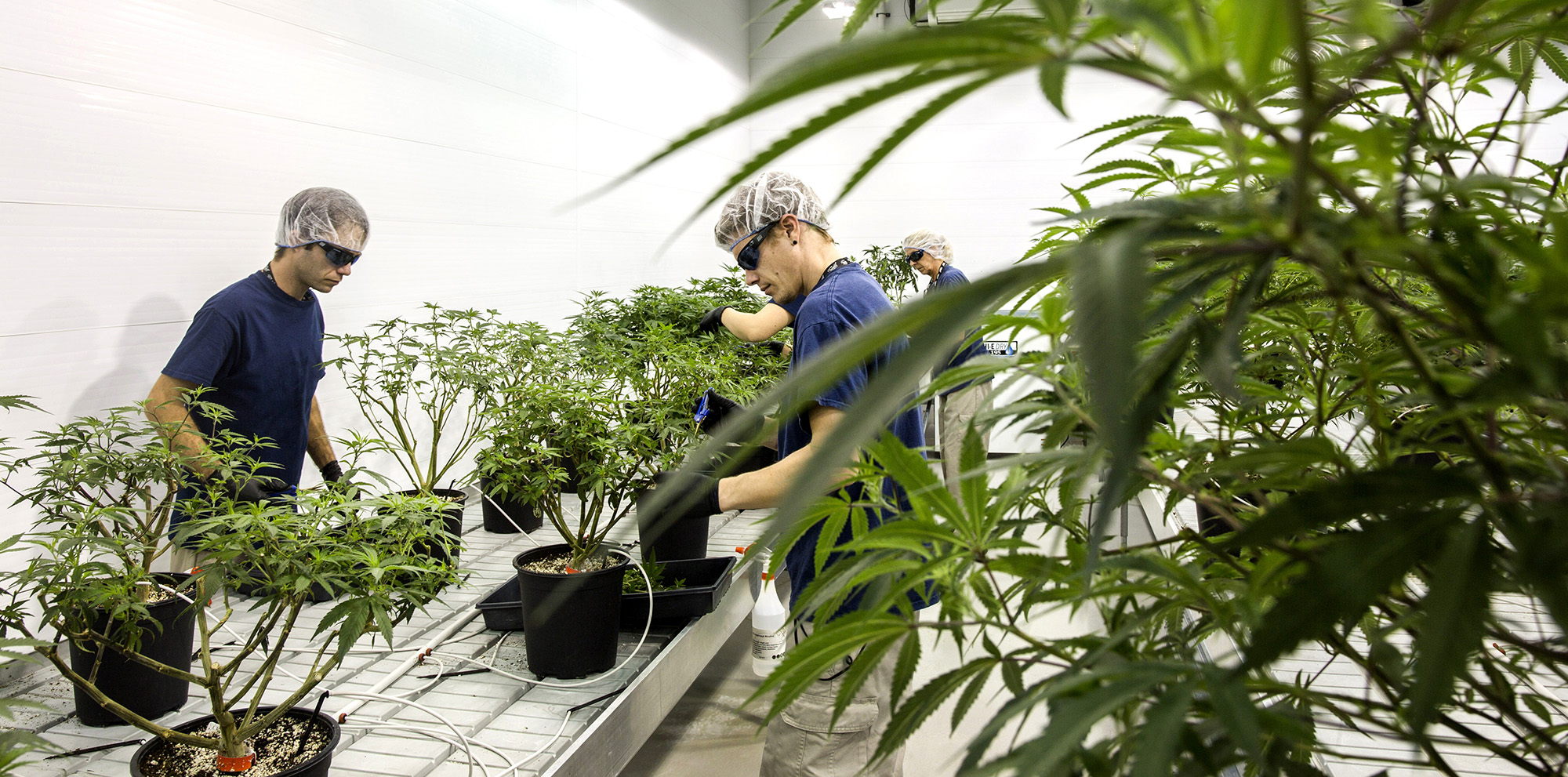 员工在安大略省史密斯福尔斯的Canopy Growth设施工作。