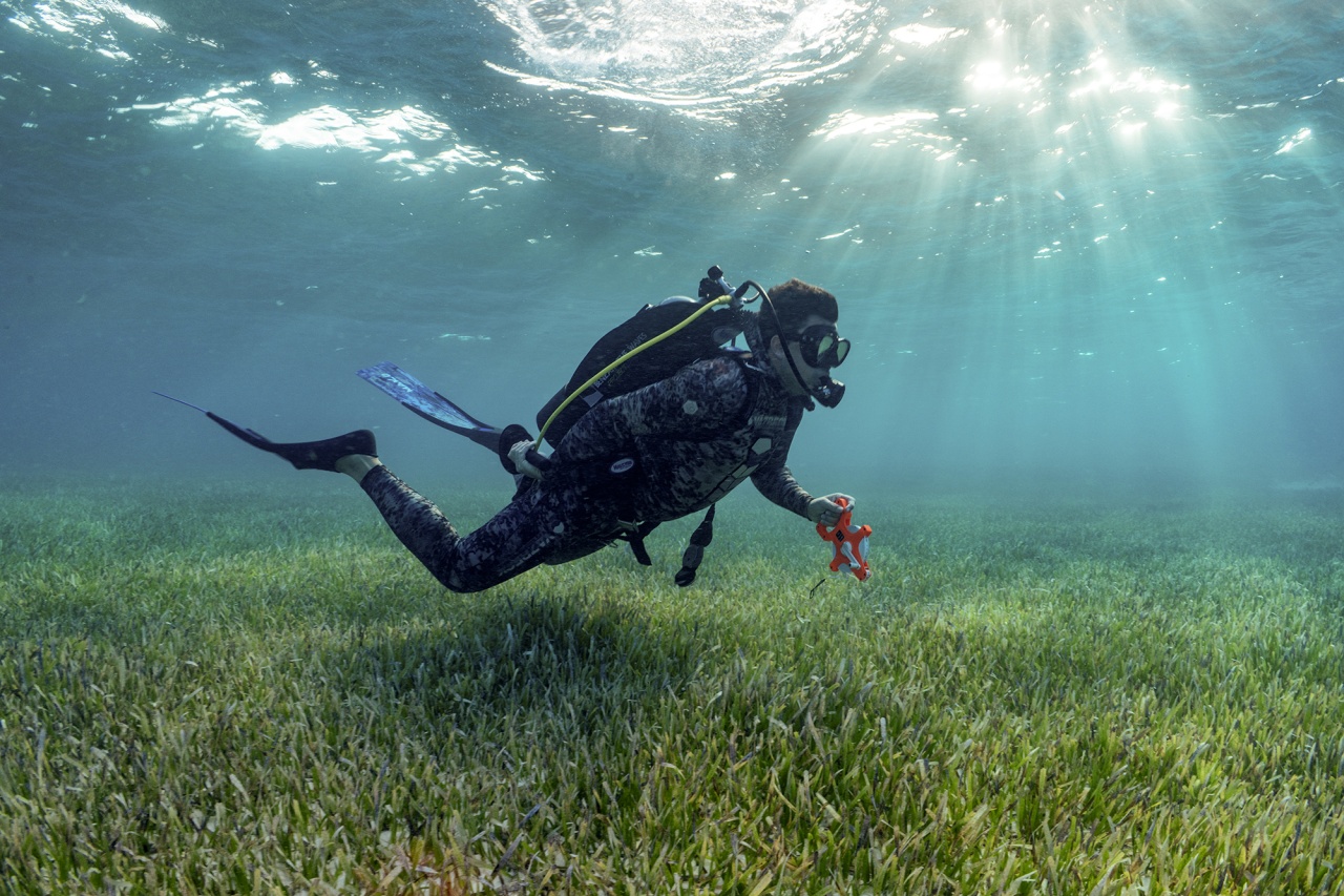 奥斯汀·加拉格尔博士与SeaLegacy联合创始人克里斯蒂娜·米特迈尔和保罗·尼克伦一起调查巴哈马银行的海草草地。