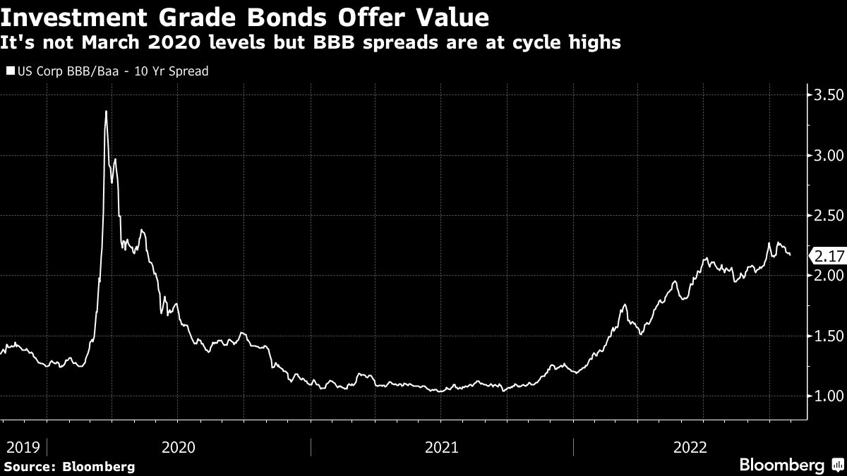对于债券来说,鹰派的顶峰意味着现在是时候投资更长期和更高质量的债券了。收益率是十多年来最高的。BBB级信用债券的收益率接近与国债的利差周期高点。