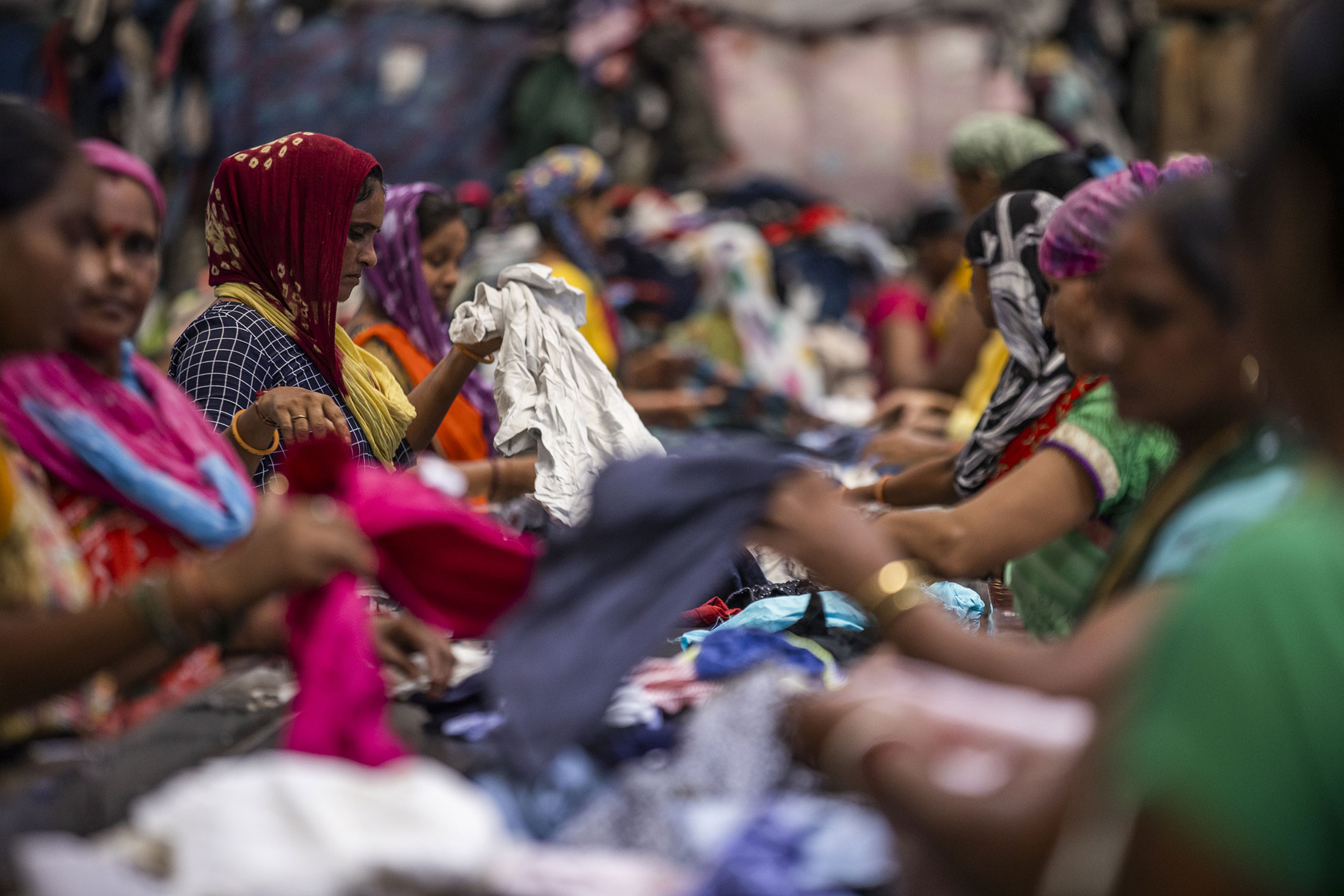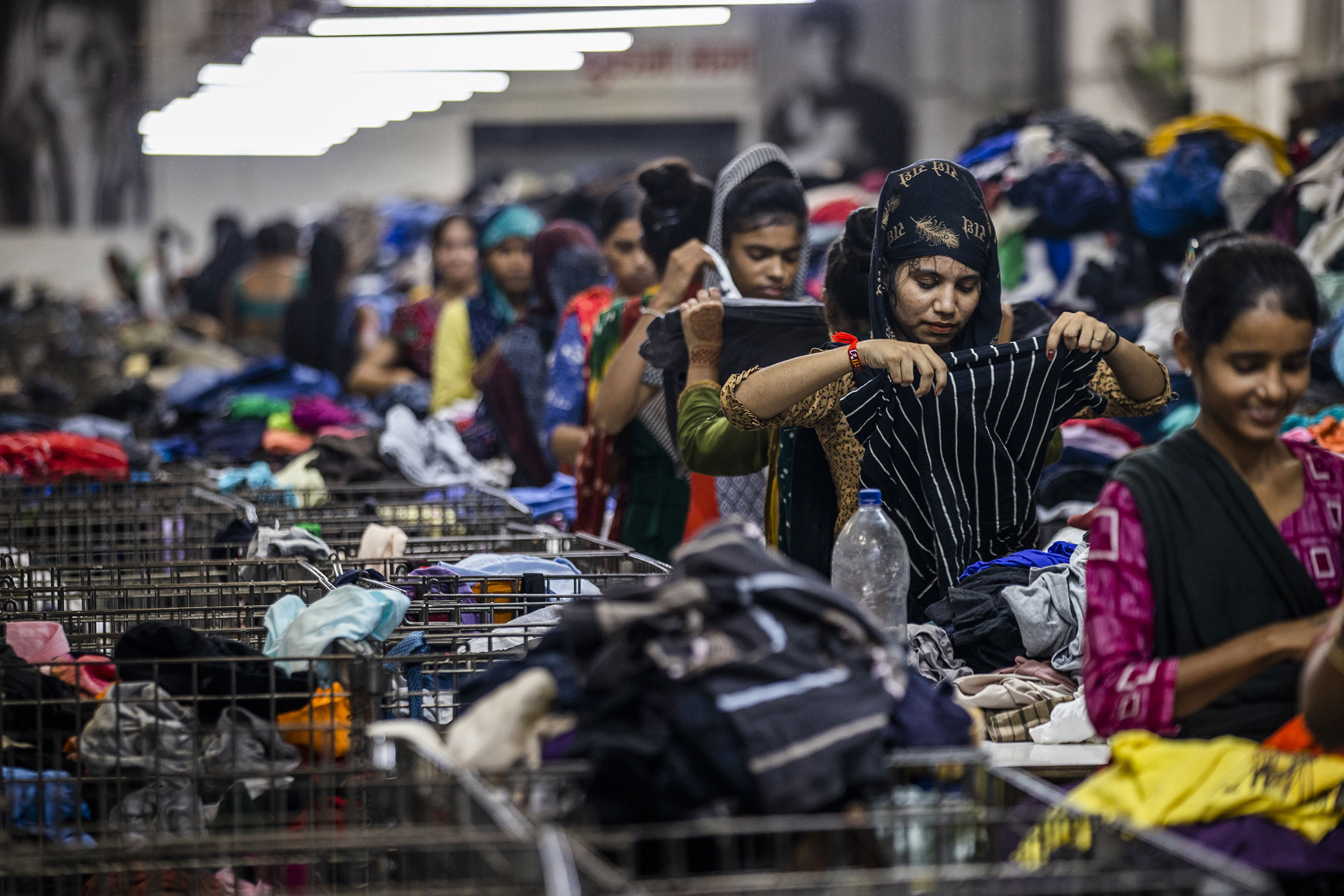 女工们从传送带上迅速取下床单、窗帘和其他非服装物品。其他人将服装分类为广泛的类别:裤子、裙子、夹克。设施内的热量令人难以忍受,超过38摄氏度(100华氏度),风扇的狂风吹动着女工们色彩鲜艳的沙丽和沙尔瓦尔长袍。