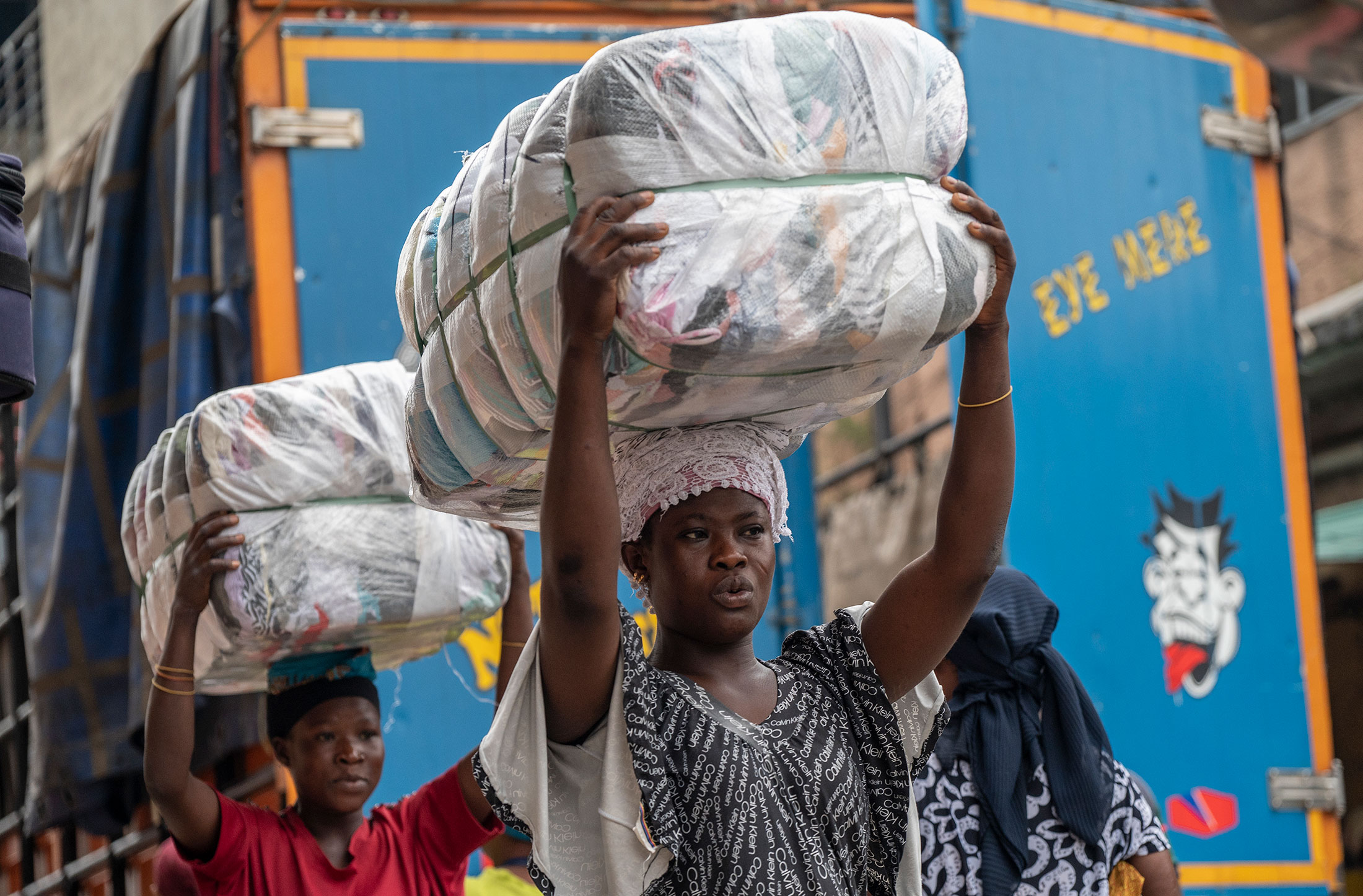 Sakina Abdulahi在一个好日子里会得到一些运送大包的工作——每次旅程都是一次危险的2公里(1.2英里)之旅,穿过坑洼、沟渠、人群和突出的铁皮屋顶,脚上穿着破旧的人字拖,背上背着一个扎在她背上的幼儿。