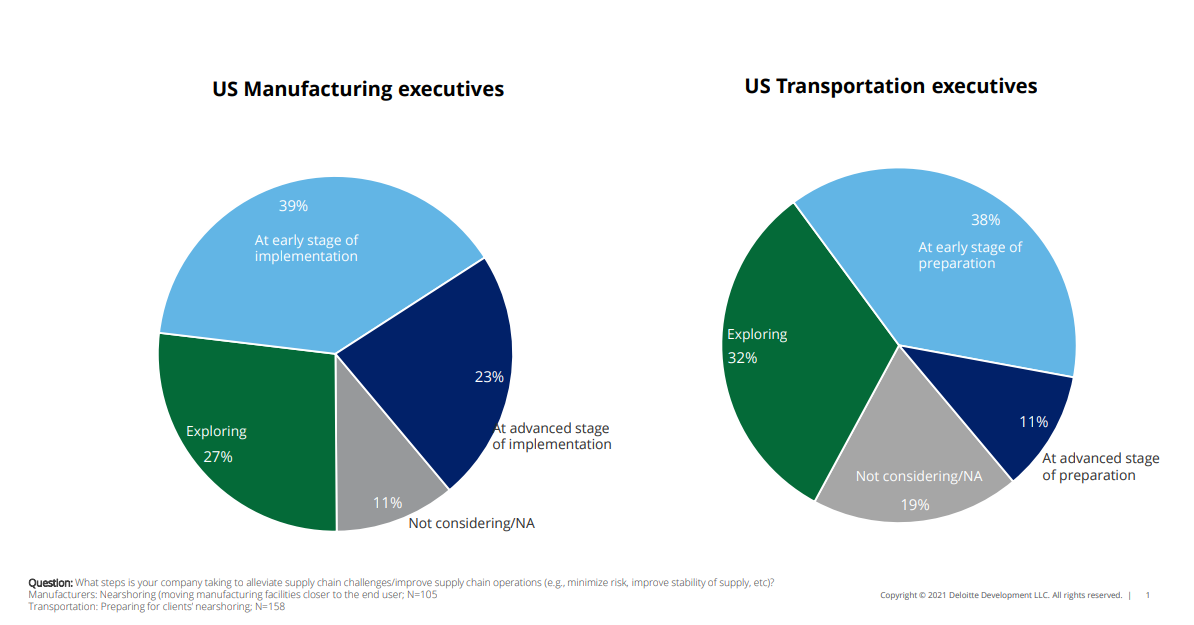 谁在重新回岸?来源:德勤调查 足够的海岸 | 美国公司正承认,重新回岸 — 曾经只是谈论的话题,但没有行动的大幅增加 — 正在加速进行,至少有一位高管对关键供应链从中国等国家转移感到“兴奋”。一项新的德勤调查显示,他们调查的制造商中有约62%已经开始重新回岸或近岸生产能力。(阅读完整故事在这里。)