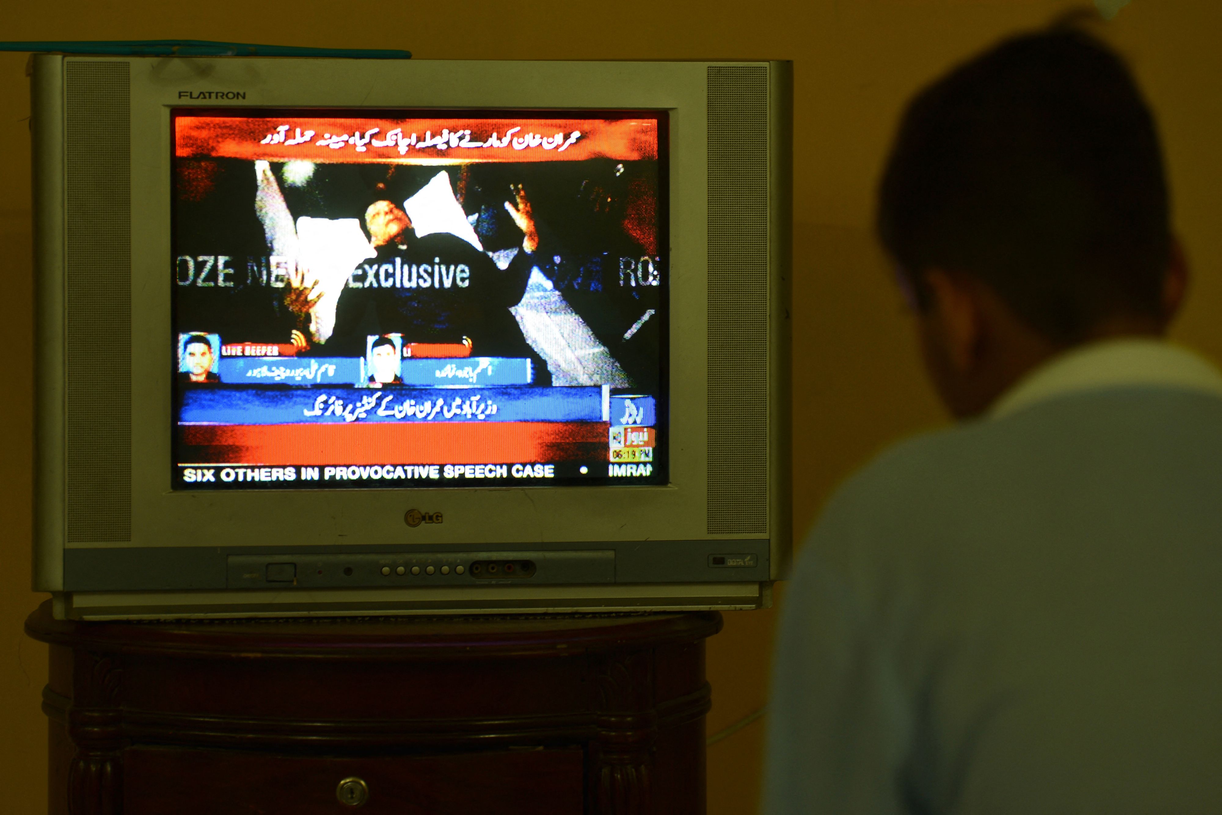 伊姆兰·汗在伊斯兰堡的一个电视频道上播报新闻,日期为11月3日。