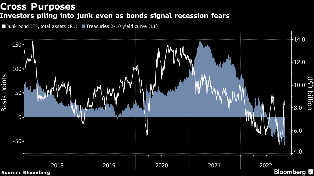 经济展望的一个关键指标之一——美国政府两年期和十年期债券收益率之间的差距——甚至在美联储采取行动之前就已经严重倒挂,现在正处于上次出现在上世纪80年代初的水平。对于那些涌入高收益债券的人来说,风险看起来很大,尽管垃圾债券的收益率现在可能已经足够高,值得冒险。彭博高收益债券指数的平均收益率约为9%——是国债指数的三倍,也高于通货膨胀率。