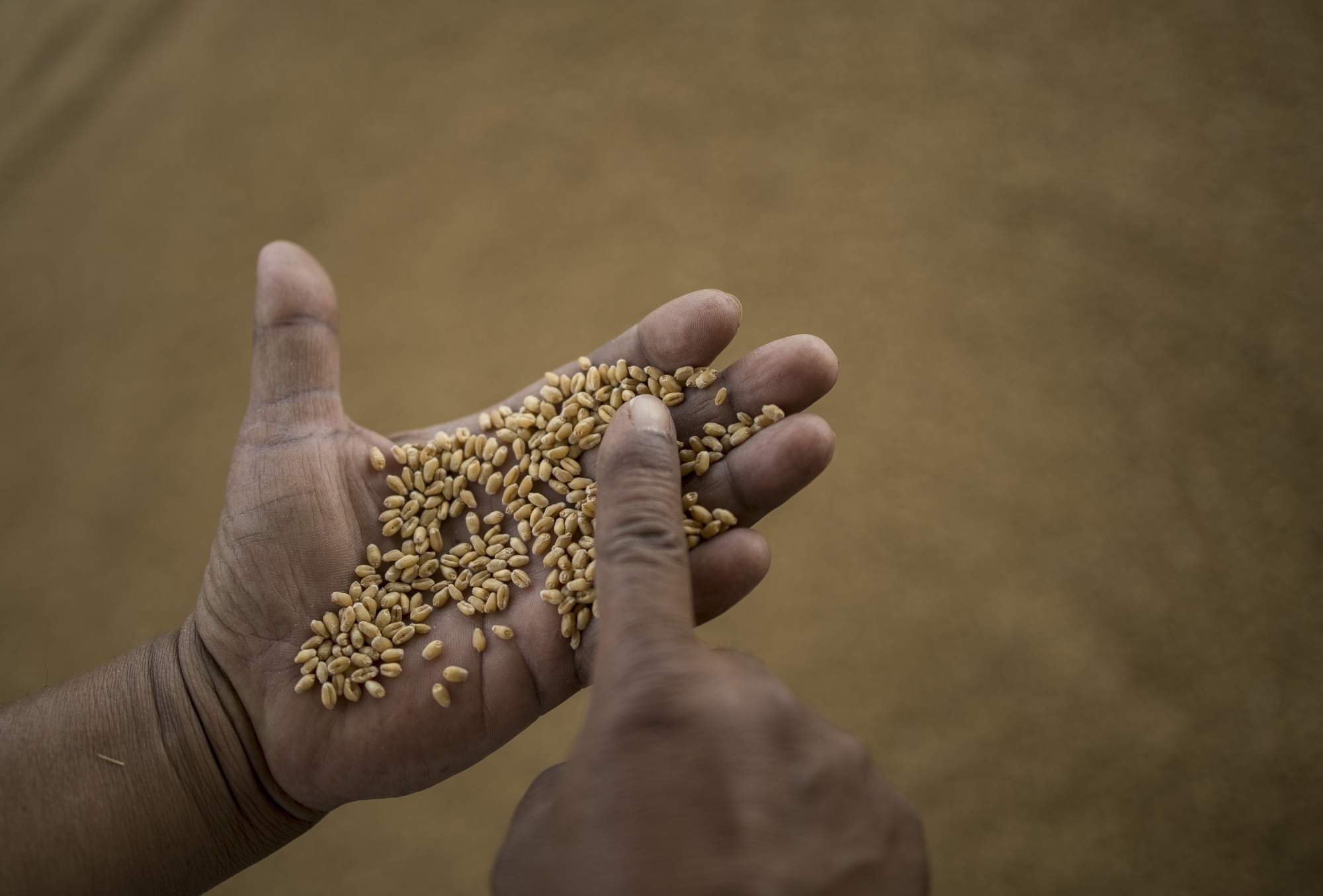 一个买家在新德里的批发市场检查小麦粒的质量。
