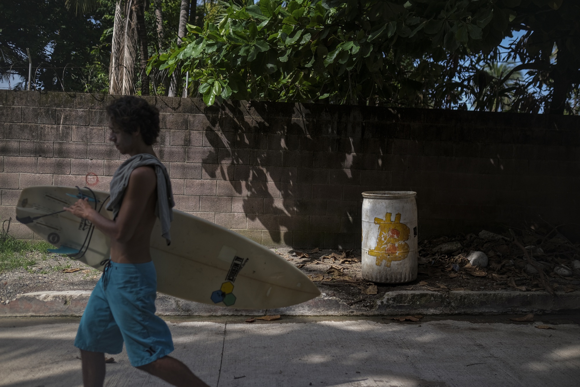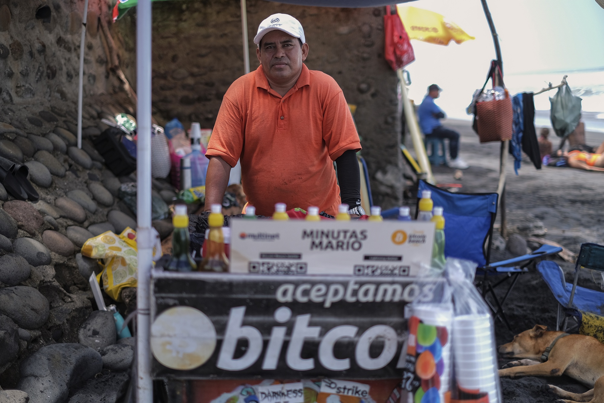 在黑沙滩上,当冲浪者穿越波浪,两个健壮的网红与他们的宝宝摆姿势拍照时,我看到了德国比特币爱好者拍摄视频的推车。店主马里奥·加西亚是镇上最早接受比特币的商人之一。他戴着一顶毛绒绒的白色帽子,一个阿迪达斯腰包,一件沾满泥土的橙色Polo衫。他的“Acceptamos Bitcoin”标志已经褪色得我几乎看不到B标志了。附近,他的妻子正在搅拌一大锅土豆做饺子。加西亚对比特币没有太多可说的。他说这是吸引游客的一种方式。他尽可能快地将他们的支付转换成美元。