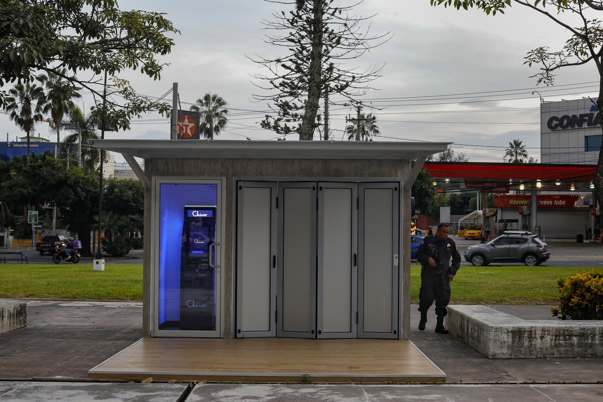在拐角处的一个广场上,一个小贩在卖一种35美分的烤玉米和香蕉饮料,街上有无家可归的人在睡觉,我顺便去了一个新的Chivo ATM。这是在首都中心的最后一搏,看看是否有人将比特币视为一种可行的金融工具。当我等待时,两辆悍马车经过,车上的士兵指着机枪,这是一个宣传新的公交安全计划的噱头。他们的两名同志在ATM旁守望,他们的脸被霓虹蓝色的Chivo标志照亮。半个小时过去了,没有人来使用它。—与Nelson Rauda Zablah合作