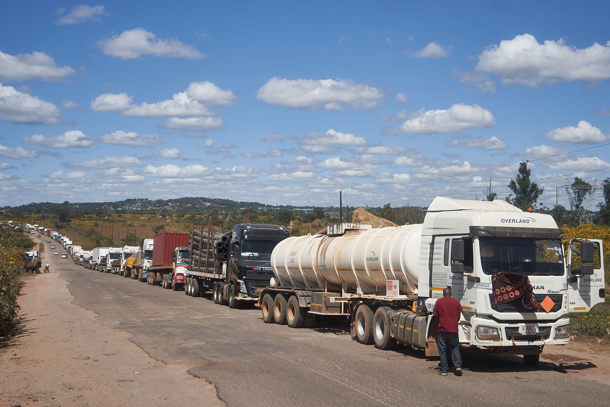 卡车在等待数天的队列中等待从赞比亚进入刚果民主共和国摄影师:Zinyange Auntony为了将一车铜从非洲运送到渴望科技的买家手中,钱达·库伦吉卡必须花一周坐在世界上最长的交通拥堵之一中。