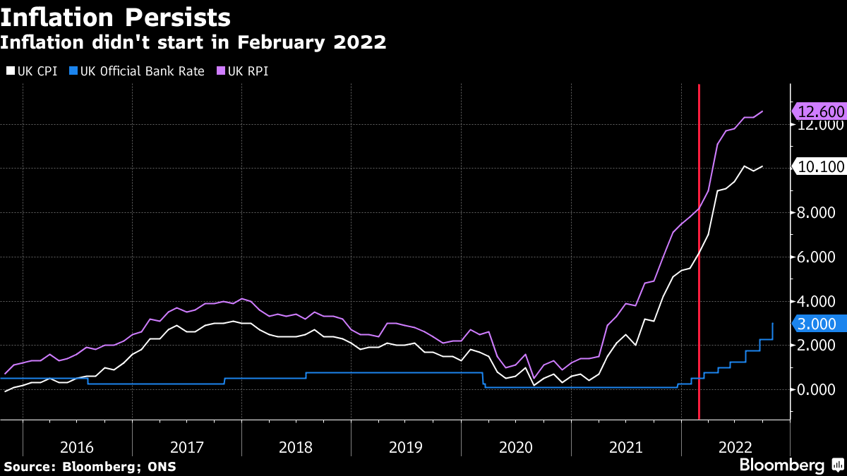 这是开始变得棘手的地方。对于央行来说,假装我们当前的通货膨胀问题主要是由俄罗斯入侵乌克兰引起的,是一种方便的虚构,因为这让他们摆脱了早些时候不采取行动的责任。