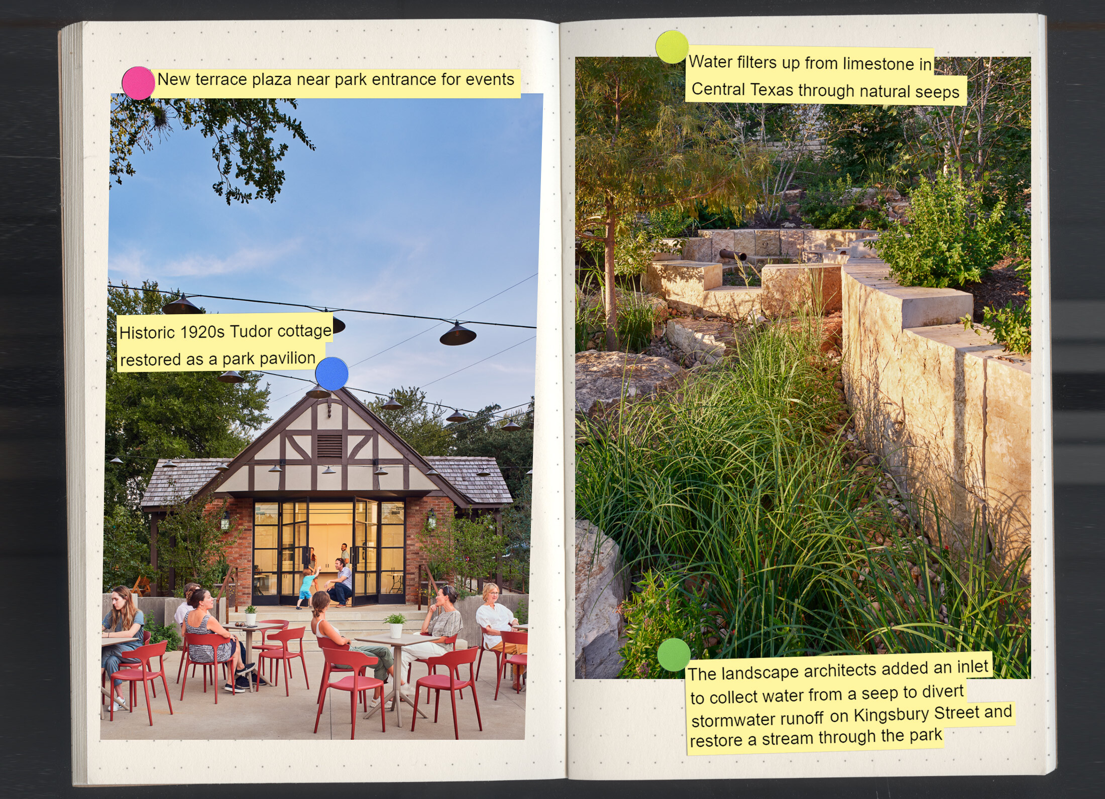 照片:Casey Dunn。插图:Stephanie Davidson通过翻新,奥斯汀工作室 Ten Eyck景观建筑师 被委托改善公园的中央入口和游乐区。设计公司 Clayton Korte 和 Mell Lawrence Architects 贡献了新的结构。这个名为Kingsbury Commons的场地举办重要活动以及日常节目。除了一些有趣的新设施外,这项价值1500万美元的翻新启动了一项策略,旨在保护一个对于不断变化的城市和气候来说具有挑战性的景观。