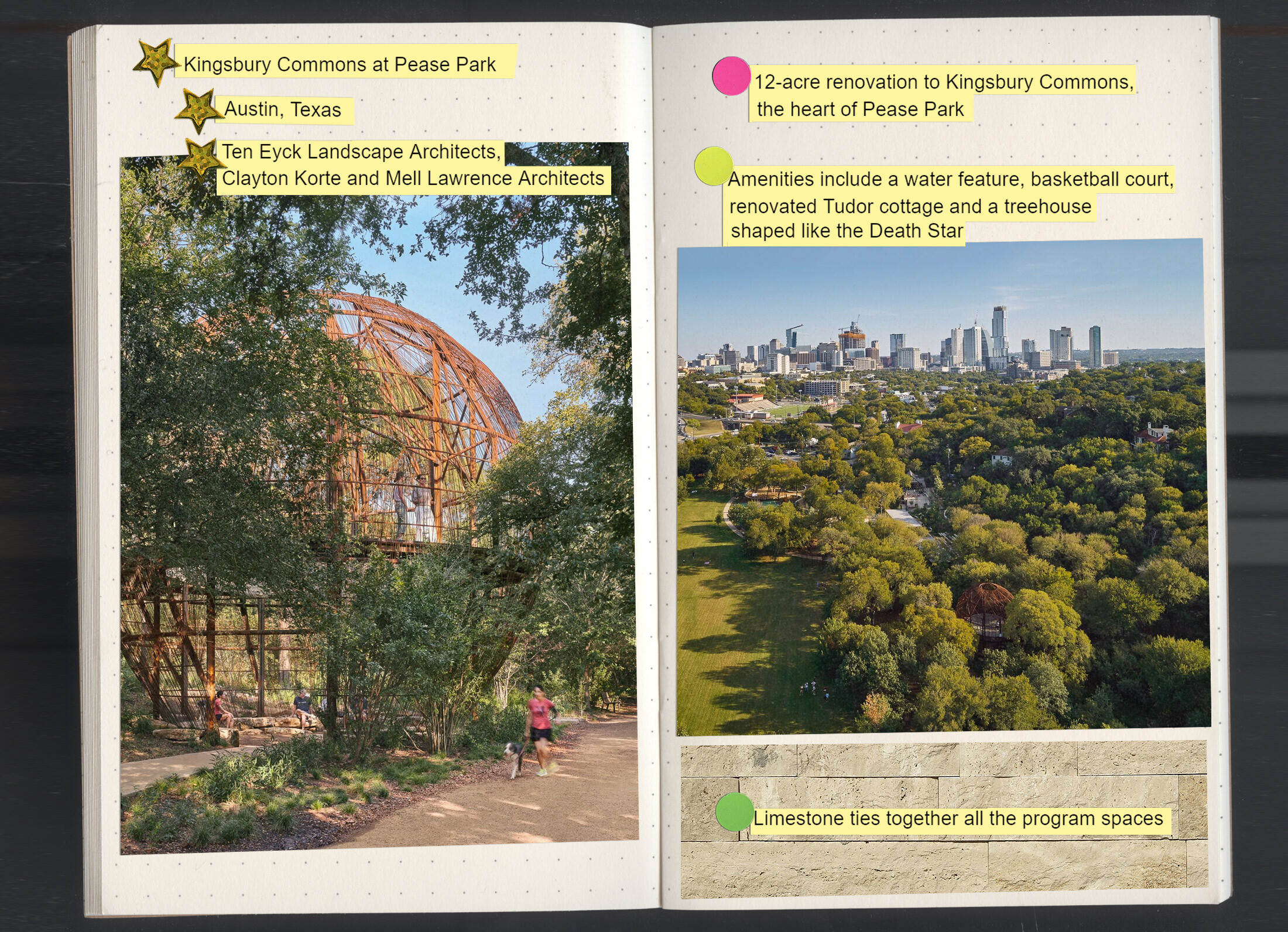 Kingsbury Commons是市政府与Pease Park Conservancy之间的公私合作伙伴关系的第一阶段,旨在恢复该公园。费城公司Wallace,Roberts & Todd的总体规划提出了一个树屋的构想,但没有提供更具体的细节。