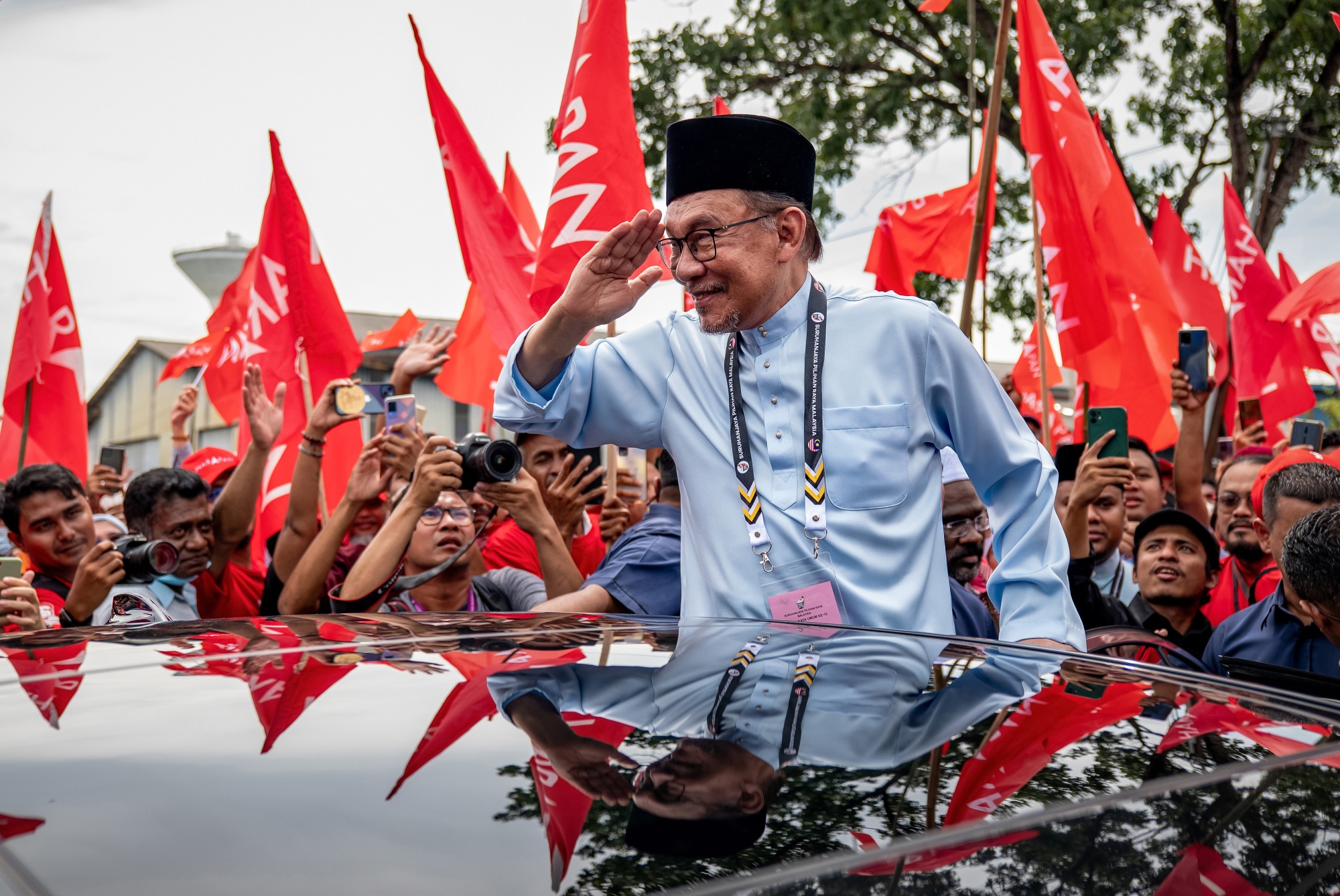 反对派领袖安华·易卜拉欣在马来西亚丹绒向支持者致意,11月5日。