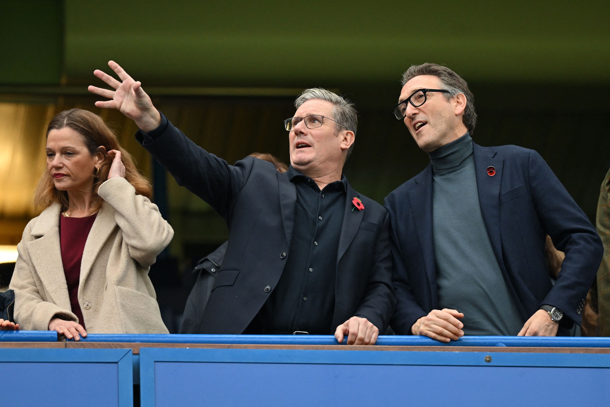基尔·斯塔默(Keir Starmer)中间,与乔纳森·戈德斯坦(Jonathan Goldstein)在11月6日伦敦观看切尔西对阿森纳比赛。摄影师:格林·柯克(Glyn Kirk)/法新社/盖蒂图片社