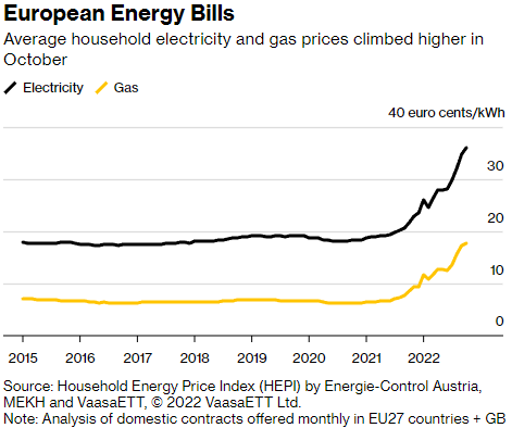 欧洲家庭为他们的电力和天然气支付的费用比以往任何时候都要高,即使各国政府花费数十亿来保护消费者免受能源危机的影响。根据能源咨询公司VaasaETT的数据,欧盟和英国的零售天然气价格几乎是去年同月的两倍。家庭电力成本飙升了67%,达到每千瓦时36欧分。都柏林的涨幅最大,电力价格上涨了44%,而罗马的平均天然气价格飙升了97%。