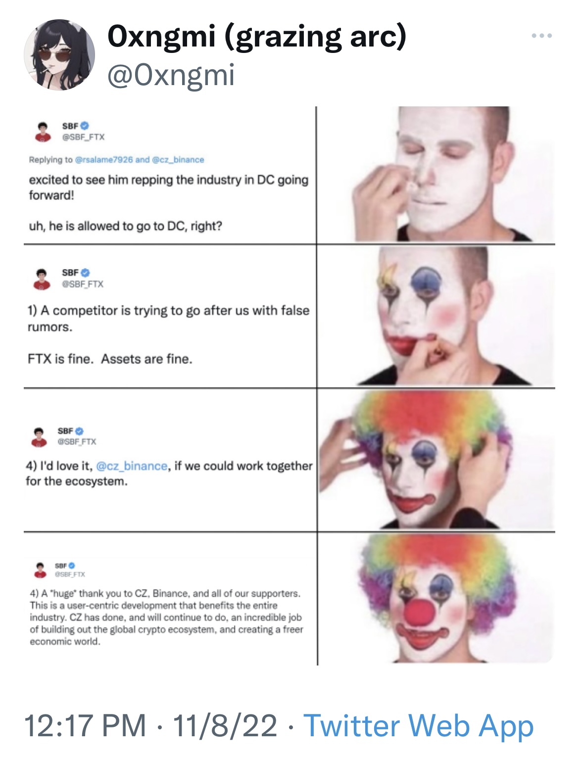 来源: @Oxngmi](https://twitter.com/0xngmi/status/1590030810929061888)此外,FTX自身庞大的帝国意味着这不是一笔易事。班克曼-弗里德正试图通过其美国分部完成一笔价值14亿美元的交易,以购买Voyager的资产 —— 这是一翼据称与币安的收购分开的 —— 也可能是那些竞标Celsius的人之一。FTX拥有价值数亿美元的多个体育赞助,从迈阿密篮球场的命名权到与梅赛德斯-AMG一项交易的权利。而FTX的流动性问题也波及到了Alameda Research,这是班克曼-弗里德共同创立的一个交易机构,该机构似乎持有大量FTT。