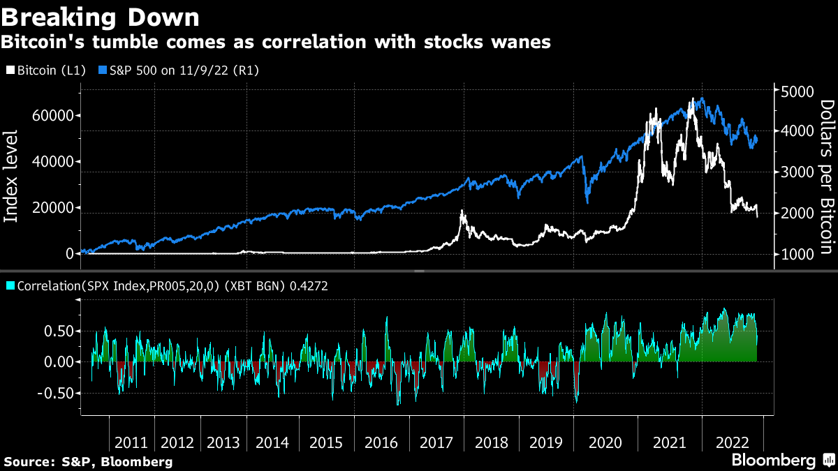 随着FTX.com挣扎求存,比特币的暴跌可能预示着加密货币市场的制度性变革。根据一项为期20天的研究,标普500指数与比特币之间的相关性已降至今年最低水平。虚拟货币可能跌至10000美元以抹去其疫情后的所有涨幅的潜力正在逼近,这对比特币而言更像是一种存在问题,而不是标普500指数下跌至2020年2月水平的问题。股票只需要下跌10%,而比特币则需要暴跌36%。