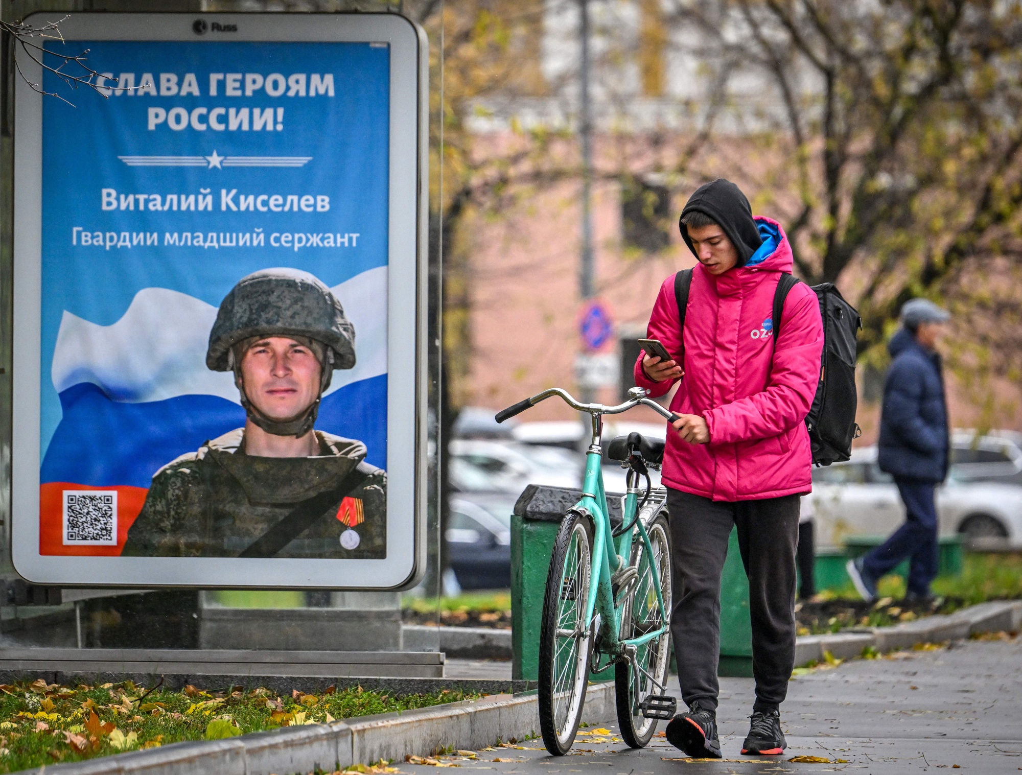 一名快递员走过莫斯科一张印有“向俄罗斯英雄致敬”的俄罗斯士兵海报。官员们警告称,九月宣布的征召令以及随后数十万俄罗斯人的离开,加剧了已经严重的劳动力短缺。