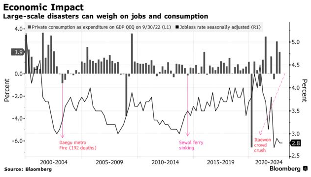 韩国首都心脏地区的悲剧可能重演先前的灾难,如2014年的世越号沉船事件,抑制消费者情绪,从而对支出、就业和货币政策产生负面连锁效应,正如 山姆·金 在这里报道。