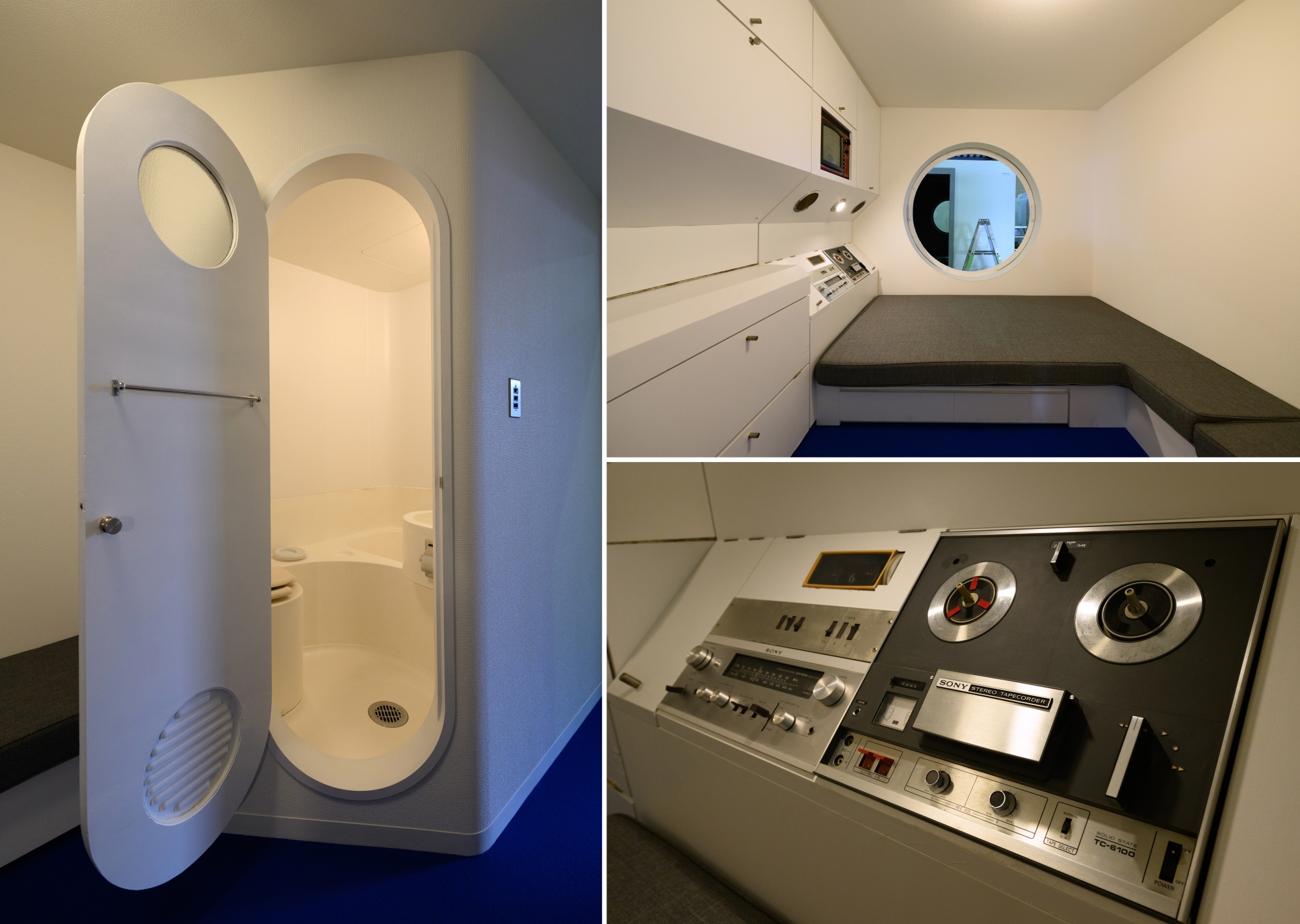 从大楼上取下的23个胶囊中,有14个正在进行全面修复,内外都在进行修复。覆盖在钢架上的石棉已经被清除。内置家具正在修复或重新制作。每个胶囊将配备原装和替换的立体声系统,包括磁带录音机。浴室已恢复到原始状态。此外还包括:小冰箱、内置书桌和床。