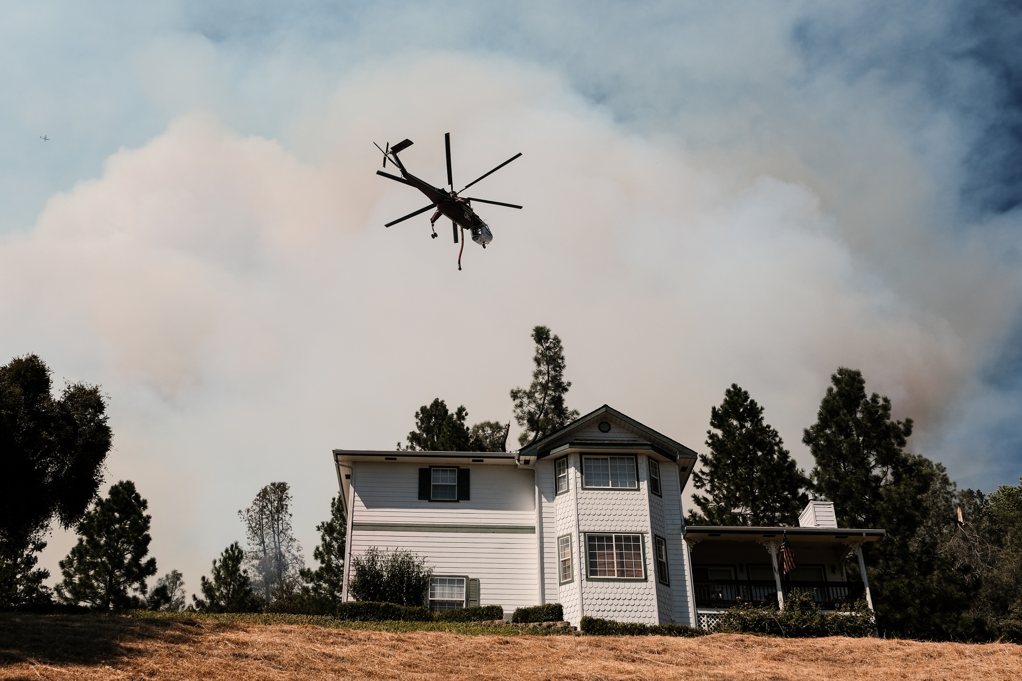 直升机飞越加利福尼亚州马里波萨县Pinecrest Drive上的一处火灾附近的住宅,日期为2022年7月23日。