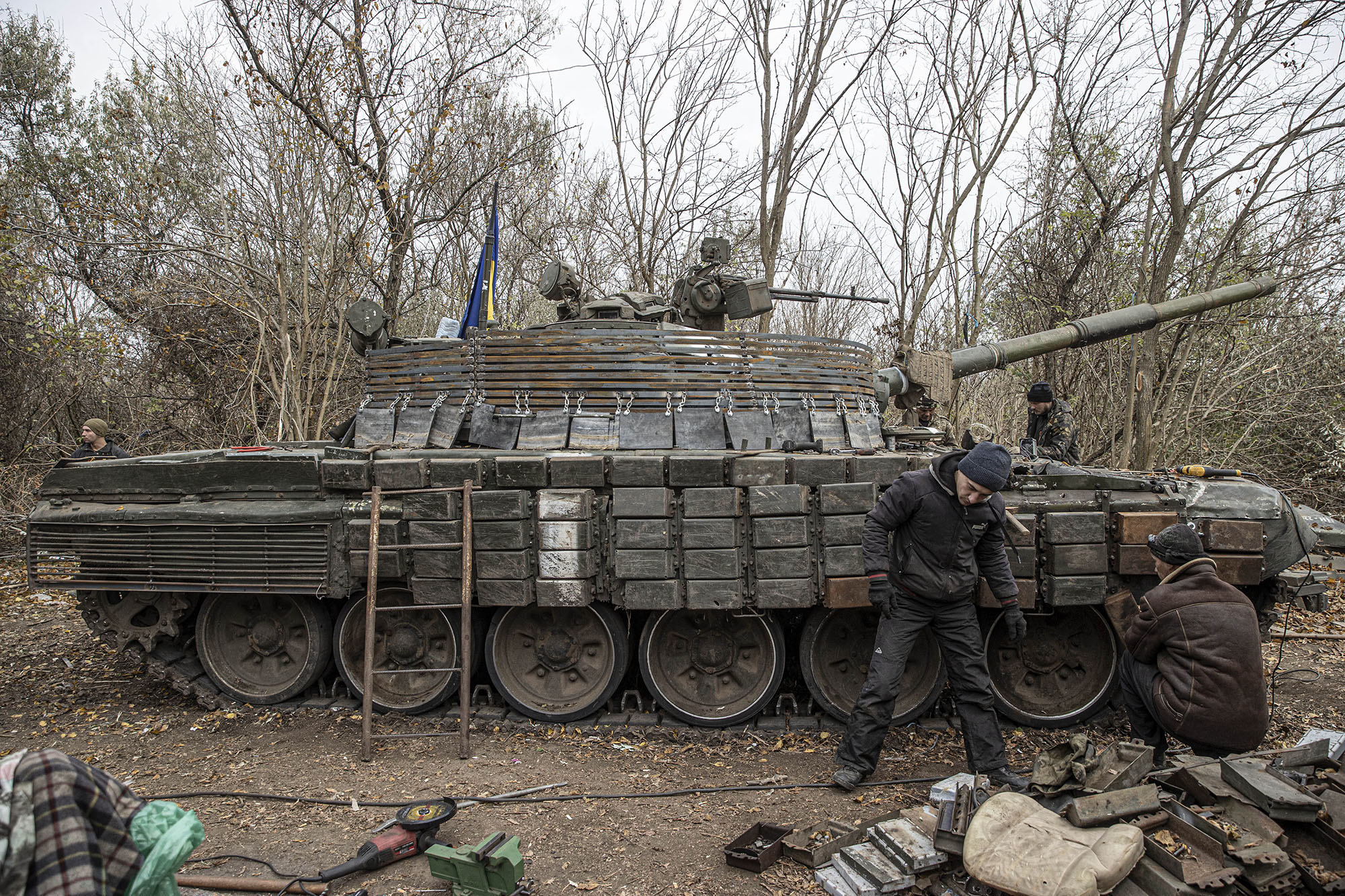 乌克兰士兵修理一辆受损的坦克,乌克兰武装部队的军事机动继续向乌克兰的赫尔松战线推进,时间是11月9日。