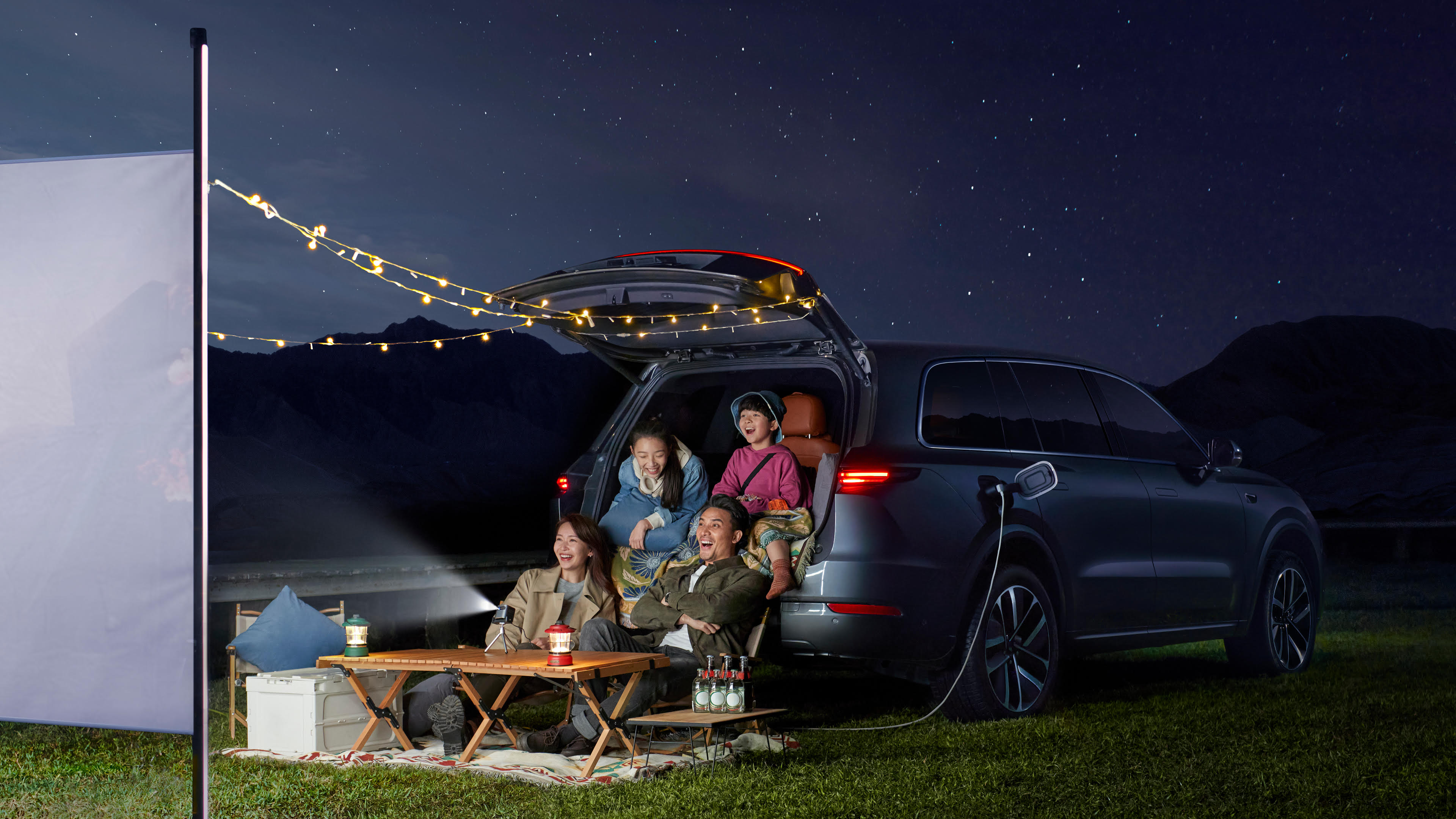 在力帆汽车的一张宣传照片中,一辆电动SUV为灯光和电影放映机提供动力。