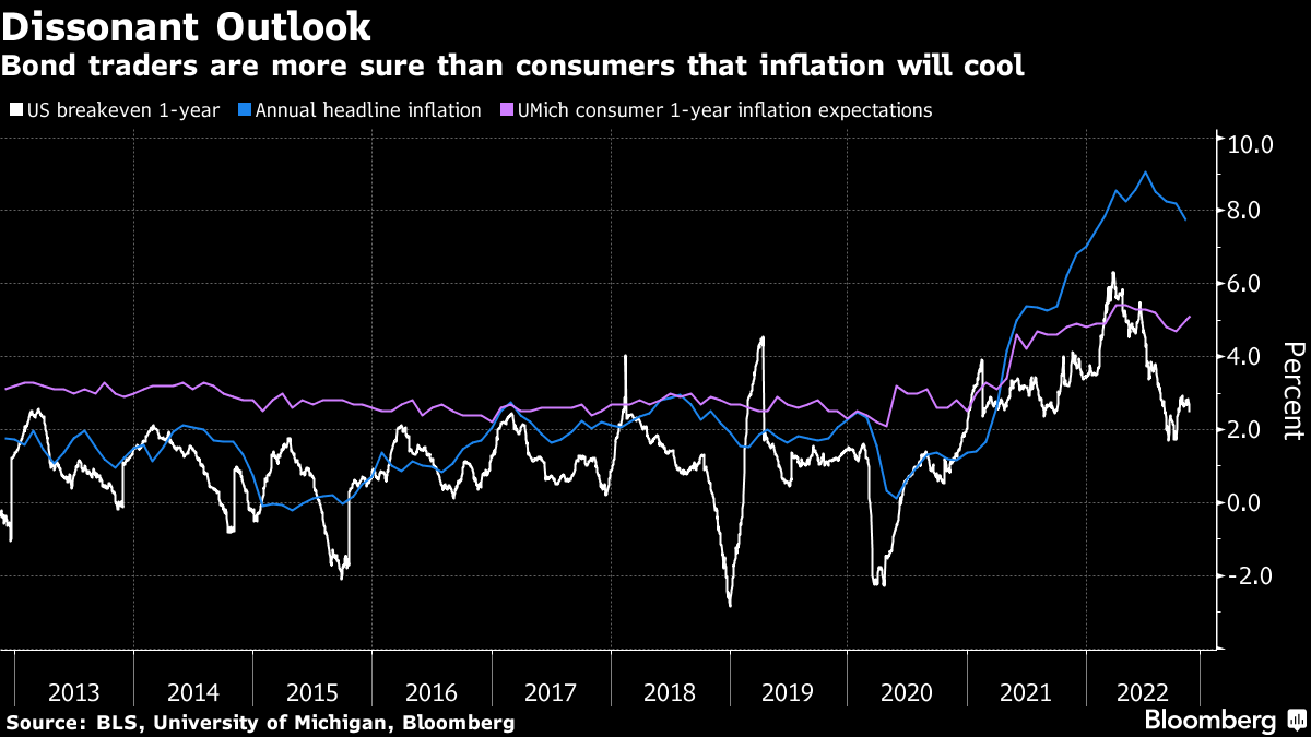 自7月以来,债券市场的指标一直在预示通胀将迅速降至年均不到3%,即使整体年度CPI持续上涨。对于美联储来说,更令人担忧的是消费者认为未来一年通胀将保持高位的方式 —— 交易员和家庭之间的差距正在扩大,这种情况通常出现在严重通缩的时期。难怪大型资金管理人打赌世界将不得不应对未来几年的高物价,专注于现金和趋势跟踪策略。风险仍然存在,即通胀可能会持续,而任何持续的降温都将需要经济非常艰难的着陆。