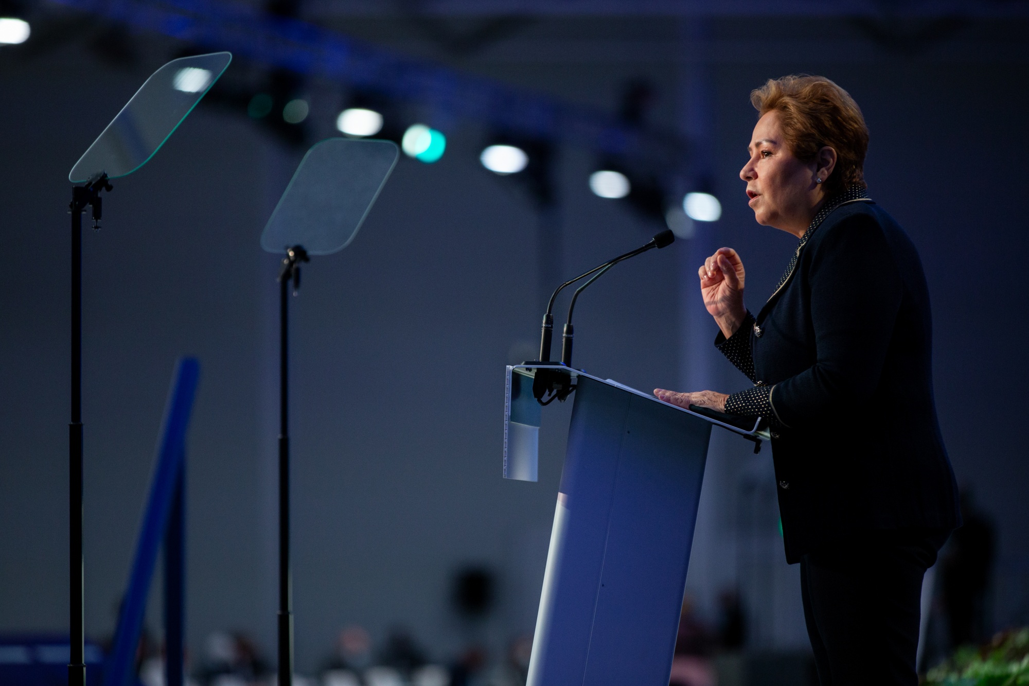 帕特里夏·埃斯皮诺萨·坎特拉诺,联合国气候变化框架公约执行秘书,在COP26开幕式上发言。