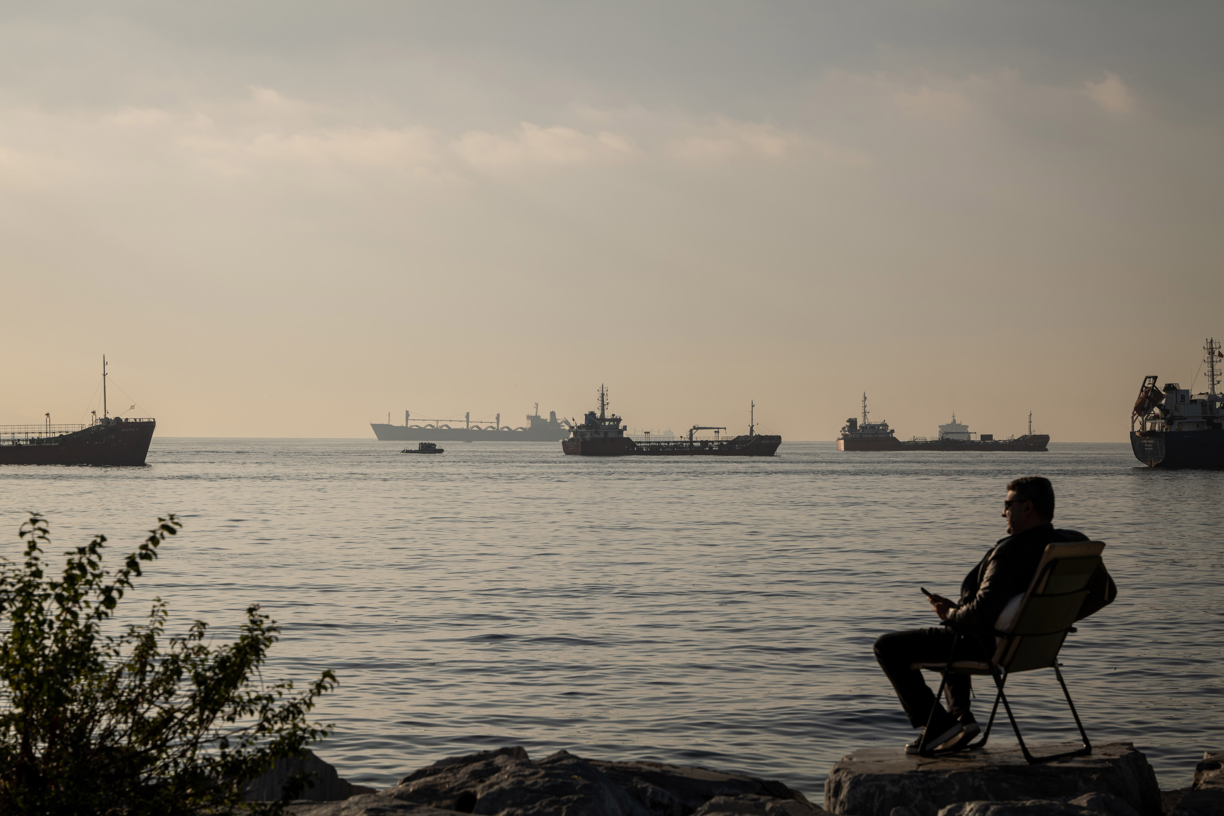 干散货船只,包括运载谷物的船只,停靠在通往黑海的博斯普鲁斯海峡南入口处,地点在土耳其伊斯坦布尔,日期为2022年11月2日。