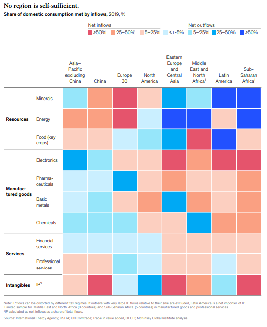 来源:麦肯锡公司目前,全球贸易流量中约60%跨越地区边界,地球上每个地区至少有四分之一的进口依赖于另一个地区的至少一种关键资源或制成品。