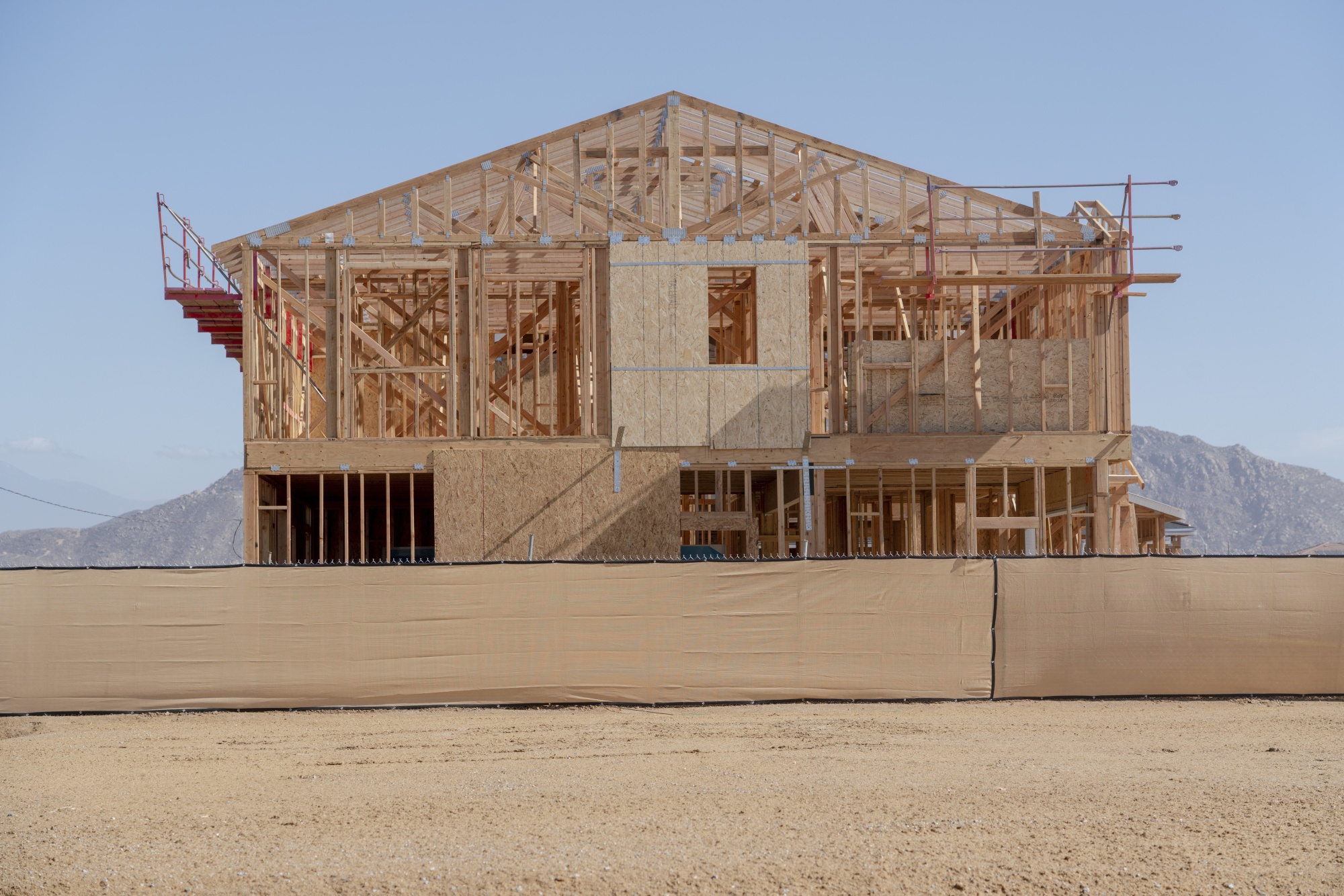 在加利福尼亚州梅尼菲的Shadow Mountain的Oak Shade正在建设中的房屋。摄影师:Kyle Grillot/Bloomberg“在白天高产能的太阳能时段,当房屋通常不使用太多电力时,我们相信太阳能系统将充足地为房屋和社区电池充电,”Brost说。