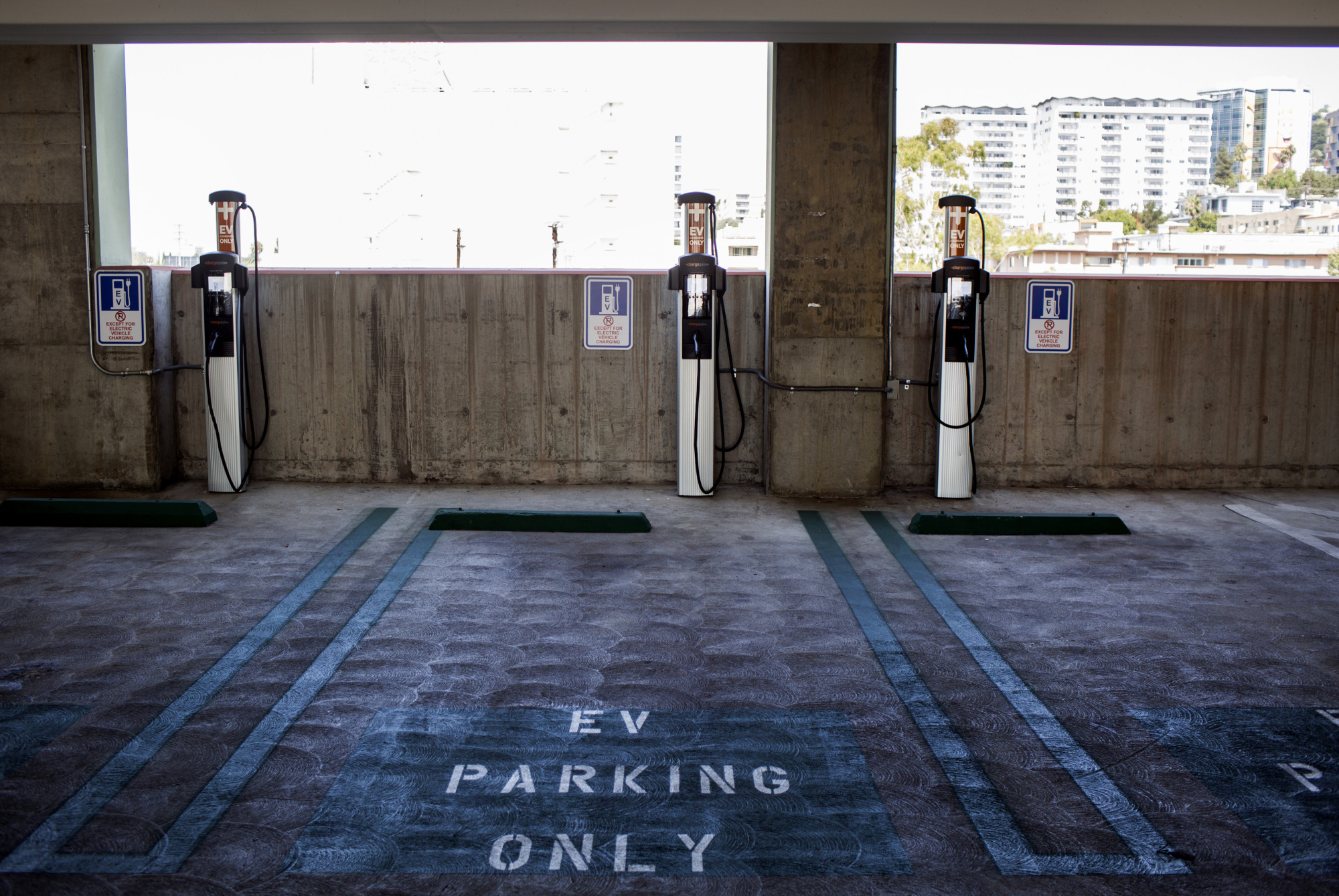 洛杉矶市政停车场内的电动汽车(EV)充电站。