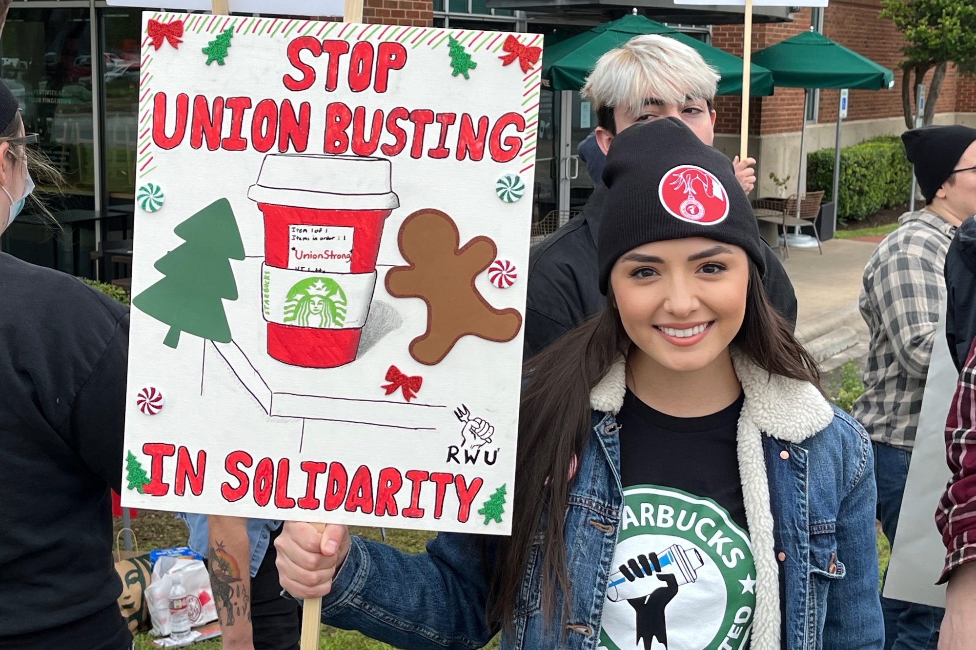 “我们收到了很多喇叭声,”她说,身上别着一枚写着“可怕的工会组织者”的徽章。