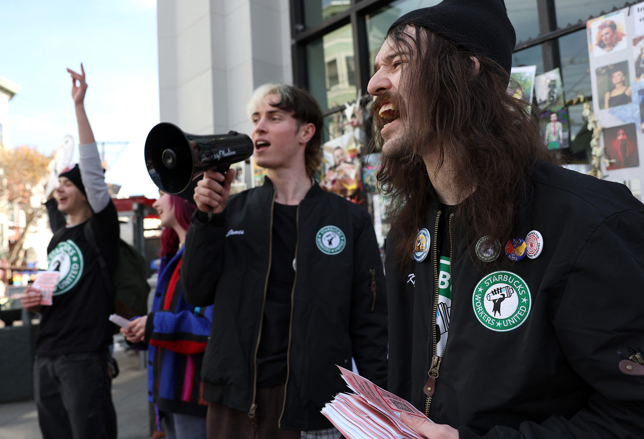 星巴克工人在旧金山的一家星巴克外面高呼口号,星期四。
