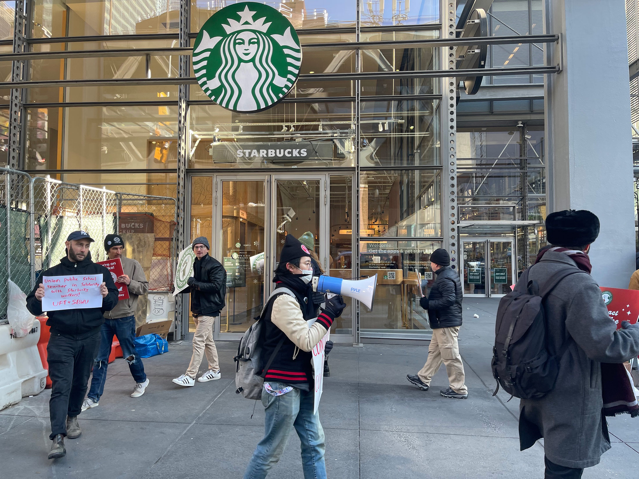 纽约市有三家店参与了罢工,曼哈顿一家,皇后区的Astoria社区两家。在Astoria Boulevard的店铺,抗议活动于周四当地时间上午7点开始,人们高呼“没有合同,就没有咖啡”,并敦促路过的汽车鸣笛支持。常客和经过Ditmars Boulevard的Astoria店的人们注意到了,并表示支持,向小费罐里投入了20美元。在曼哈顿,支持者给寒冷的工人带来了可可饮料。